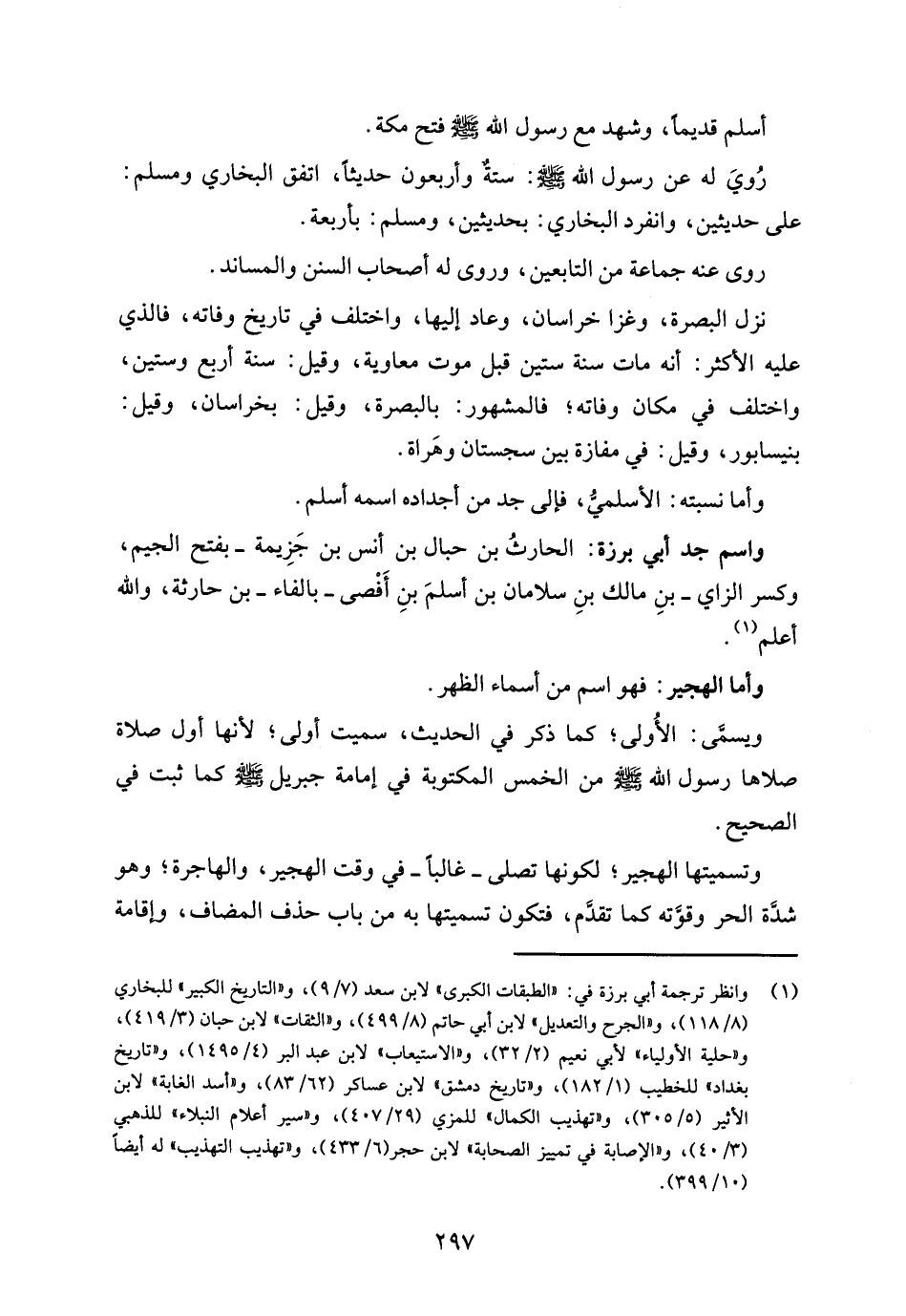 (¬1) وانظر ترجمة أبي برزة في: "الطبقات الكبرى" لابن سعد (7/ 9)، و"التاريخ الكبير" للبخاري (8/ 118)، و "الجرح والتعديل" لابن أبي حاتم (8/ 499)، و "الثقات" لابن حبان (3/ 419)، و "حلية الأولياء" لأبي نعيم (2/ 32)، و"الاستيعاب" لابن عبد البر (4/ 1495)، و"تاريخ بغداد" للخطيب (1/ 182)، و "تاريخ دمشق" لابن عساكر (62/ 83)، و "أسد الغابة" لابن الأثير (5/ 305)، و"تهذيب الكمال" للمزي (29/ 407)، و"سير أعلام النبلاء" للذهبي (3/ 40)، و"الإصابة في تميز الصحابة" لابن حجر (6/ 433)، و"تهذيب التهذيب" له أيضًا (10/ 399).