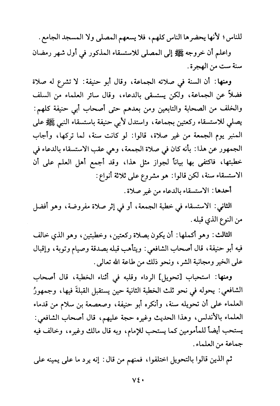 ومنها: أن السنة في صلاته الجماعة، وقال أبو حنيفة: لا تشرع له صلاة فضلًا عن الجماعة، ولكن يستسقى بالدعاء، وقال سائر العلماء من السلف والخلف من الصحابة والتابعين ومن بعدهم حتى أصحاب أبي حنيفة كلهم: يصلي للاستسقاء ركعتين بجماعة، واستدل لأبي حنيفة باستسقاء النبي - صلى الله عليه وسلم - على المنبر يوم الجمعة من غير صلاة، قالوا: لو كانت سنة، لما تركها، وأجاب الجمهور عن هذا: بأنه كان في صلاة الجمعة، وهي عقب الاستسقاء بالدعاء في خطبتها، فاكتفى بها بيانًا لجواز مثل هذا، وقد أجمع أهل العلم على أن الاستسقاء سنة، لكن قالوا: هو مشروع على ثلاثة أنواع: