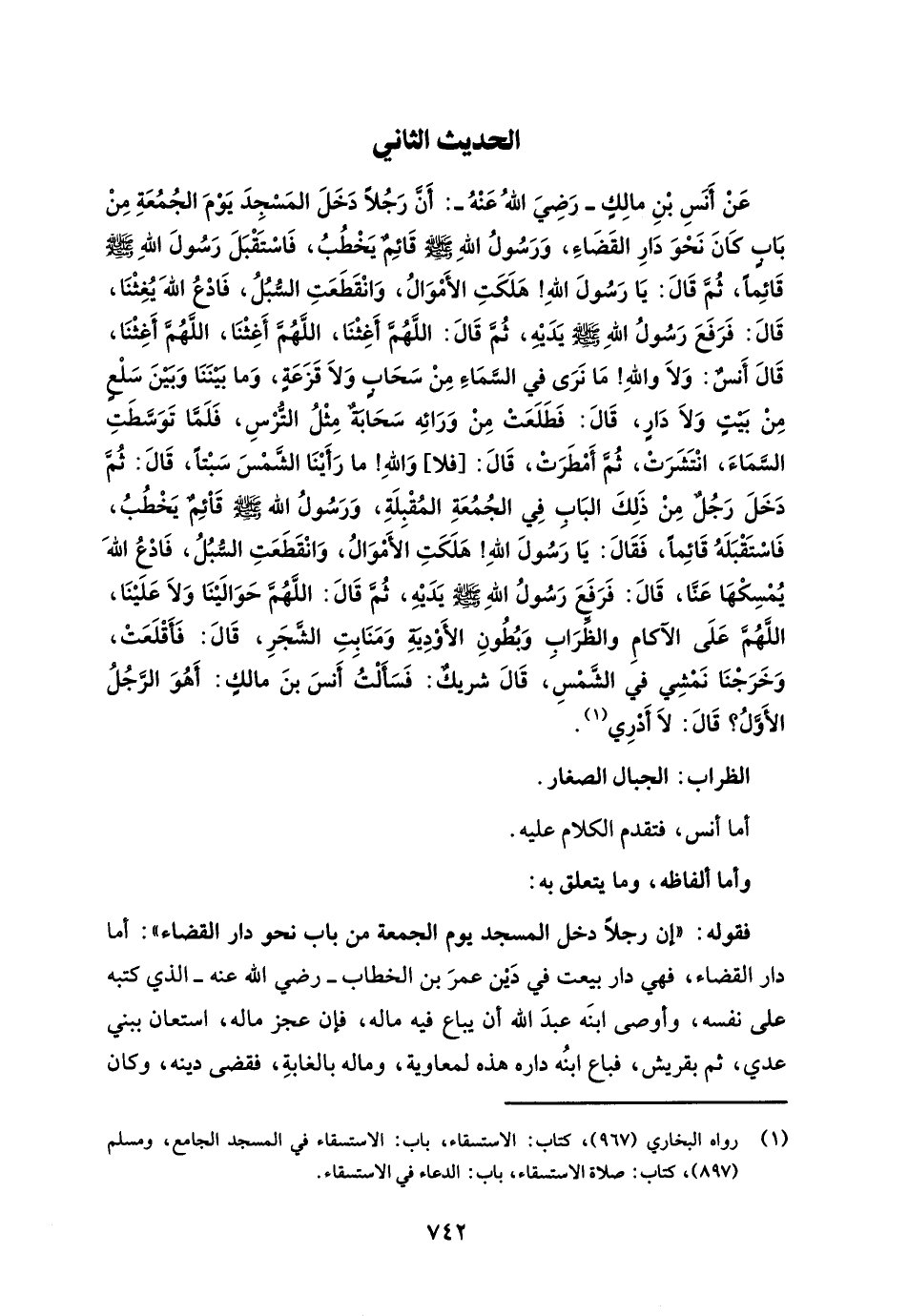 عَنْ أَنَسِ بْنِ مالِكٍ -رَضِيَ اللهُ عَنْهُ-: أَن رَجُلًا دَخَلَ المَسجِدَ يَومَ الجُمُعَةِ مِنْ بَابٍ كَانَ نَحْوَ دَارِ القَضَاءِ، وَرَسُولُ اللهِ - صلى الله عليه وسلم - قَائِم يَخْطُبُ، فَاستَقْبَلَ رَسُولَ اللهِ - صلى الله عليه وسلم - قَائِمًا، ثُمَّ قَالَ: يَا رَسُولَ اللهِ! هَلَكَتِ الأَمْوَالُ، وَانْقَطَعَتِ السبُلُ، فَادعُ اللهَ يُغِثْنَا، قَالَ: فَرَفَعَ رَسُولُ اللهِ - صلى الله عليه وسلم - يَدَيْهِ، ثُم قَالَ: اللهم أَغِثْنَا، اللَّهُمَّ أَغِثْنَا، اللهم أَغِثْنَا، قَالَ أَنسٌ: وَلَا واللهِ! مَا نَرَى في السمَاء مِنْ سَحَاب وَلَا قَزَعَةٍ، وَما بيننَا وَبينَ سَلْع مِنْ بيتٍ وَلَا دَارٍ، قَالَ: فَطَلَعَتْ مِنْ وَرَائِه سَحَابةٌ مِثْلُ التُّرْسِ، فَلَمَّا تَوَسَّطَتِ السمَاءَ، انْتَشَرَتْ، ثُم أَمْطَرَتْ، قَالَ: [فلا] وَاللهِ! ما رَأَيْنَا الشَّمْسَ سَبْتًا، قَالَ: ثُمَّ دَخَلَ رَجُلٌ مِنْ ذَلِكَ البَابِ فِي الجُمُعَةِ المُقْبلَةِ، وَرَسُولُ الله - صلى الله عليه وسلم - قَائِمٌ يَخْطُبُ، فَاسْتَقْبَلَهُ قَائِمًا، فَقَالَ: يَا رَسُولَ اللهِ! هَلَكَتِ اَلأَمْوَالُ، وَانْقَطَعَتِ السبُلُ، فَادْعُ اللهَ يُمْسِكْهَا عَنا، قَالَ: فَرَفعَ رَسُولُ اللهِ - صلى الله عليه وسلم - يَدَيْهِ، ثُم قَالَ: اللَّهُمَ حَوَالَيْنَا وَلَا عَلَيْنَا، اللهم عَلَى الآكامِ والظِّرَابِ وَبُطُونِ الأَوْدِيةِ وَمَنَابِتِ الشَّجَرِ، قَالَ: فَأقْلَعَتْ، وَخَرَجْنَا نَمْشِي في الشَّمْسِ، قَالَ شريك: فَسَألْتُ أَنس بنَ مالكٍ: أَهُوَ الرَّجُل الأَولُ؟ قَالَ: لَا أَدْرِي (¬1).
