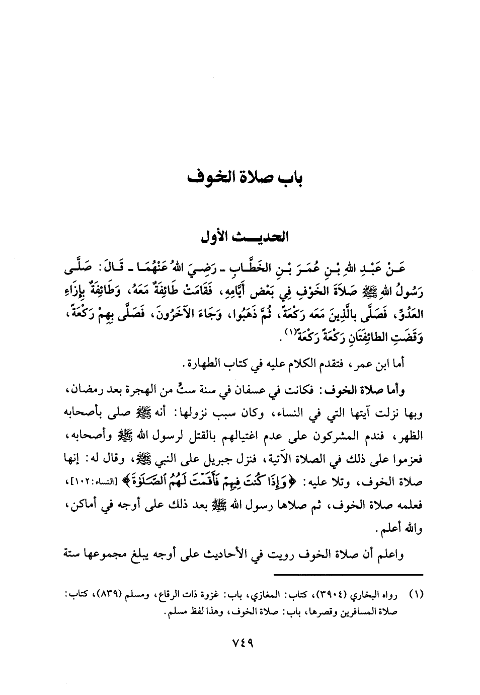 عَنْ عَبْدِ اللهِ بْنِ عُمَرَ بْنِ الخَطَّابِ -رَضِيَ اللهُ عَنْهُمَا- قَالَ: صَلَّى رَسُول اللهِ - صلى الله عليه وسلم - صَلاة الخَوْفِ فِي بَعْض أيَّامِهِ، فَقَامَتْ طَائِفَةٌ مَعَهُ، وَطَائِفَةٌ بِإزَاء العَدُوِّ، فَصَلَّى بالذِينَ مَعَه رَكعَة، ثمَّ ذَهَبُوا، وَجَاءَ الآخَرُونَ، فَصَلى بِهِمْ رَكْعَة، وَقَضَتِ الطائِفَتانِ رَكعَة رَكْعَةً (¬1).