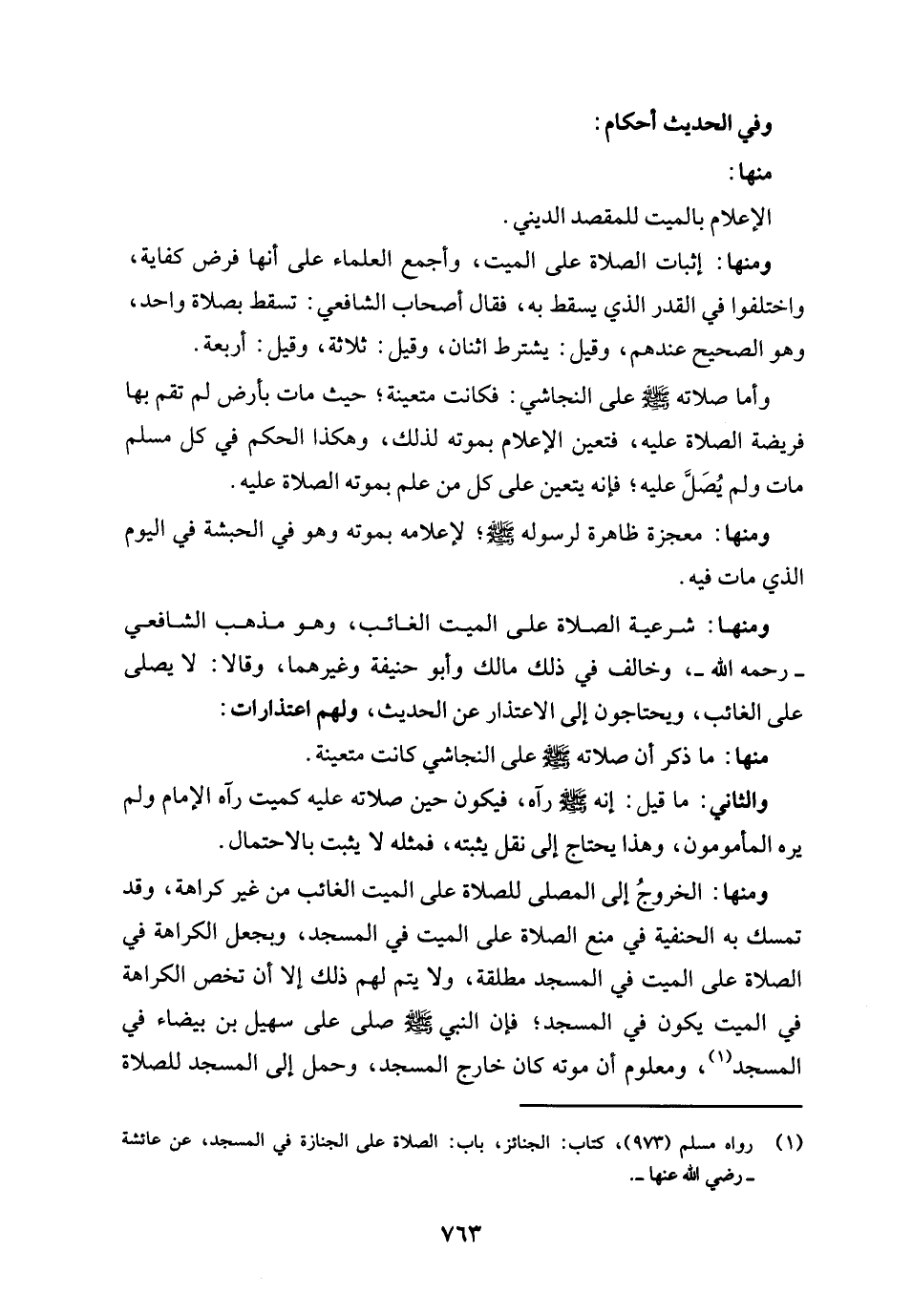 ومنها: إثبات الصلاة على الميت، وأجمع العلماء على أنها فرض كفاية، واختلفوا في القدر الذي يسقط به، فقال أصحاب الشافعي: تسقط بصلاة واحد، وهو الصحيح عندهم، وقيل: يشترط اثنان، وقيل: ثلاثة، وقيل: أربعة.