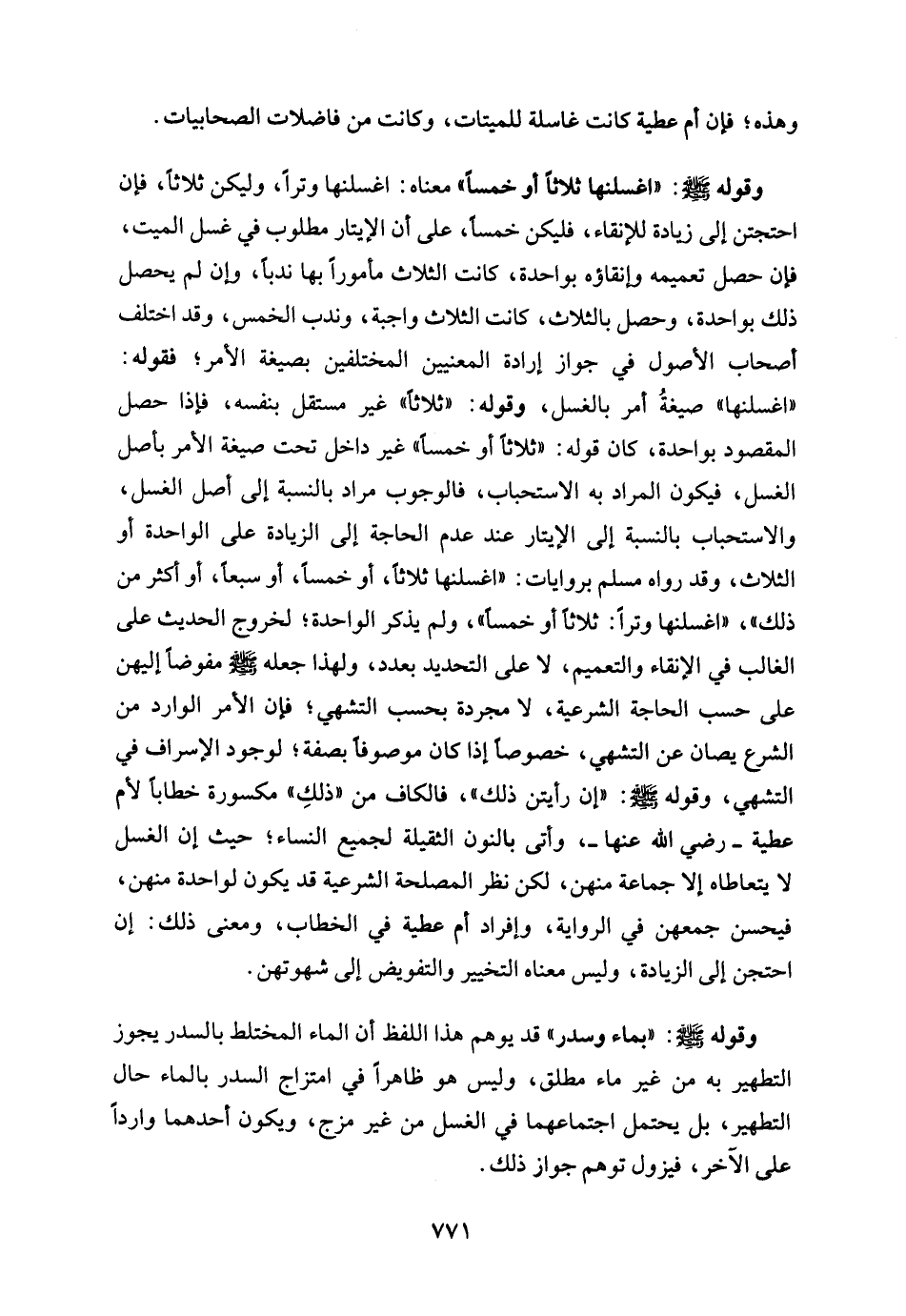 وقوله - صلى الله عليه وسلم -: "اغسلنها ثلاثًا أو خمسًا" معناه: اغسلنها وترًا، وليكن ثلاثًا، فإن احتجتن إلى زيادة للإنقاء، فليكن خمسًا، على أن الإيتار مطلوب في غسل الميت، فإن حصل تعميمه وإنقاؤه بواحدة، كانت الثلاث مأمورًا بها ندبًا، وإن لم يحصل ذلك بواحدة، وحصل بالثلاث، كانت الثلاث واجبة، وندب الخمس، وقد اختلف أصحاب الأصول في جواز إرادة المعنيين المختلفين بصيغة الأمر؛ فقوله: "اغسلنها" صيغةُ أمر بالغسل، وقوله: "ثلاثًا" غير مستقل بنفسه، فإذا حصل المقصود بواحدة، كان قوله: "ثلاثًا أو خمسًا" غير داخل تحت صيغة الأمر بأصل الغسل، فيكون المراد به الاستحباب، فالوجوب مراد بالنسبة إلى أصل الغسل، والاستحباب بالنسبة إلى الإيتار عند عدم الحاجة إلى الزيادة على الواحدة أو الثلاث، وقد رواه مسلم بروايات: "اغسلنها ثلاثًا، أو خمسًا، أو سبعًا، أو أكثر من ذلك"، "اغسلنها وترًا: ثلاثًا أو خمسًا"، ولم يذكر الواحدة؛ لخروج الحديث على الغالب في الإنقاء والتعميم، لا على التحديد بعدد، ولهذا جعله - صلى الله عليه وسلم - مفوضًا إليهن على حسب الحاجة الشرعية، لا مجردة بحسب التشهي؛ فإن الأمر الوارد من الشرع يصان عن التشهي، خصوصًا إذا كان موصوفًا بصفة؛ لوجود الإسراف في التشهي، وقوله - صلى الله عليه وسلم -: "إن رأيتن ذلك"، فالكاف من "ذلكِ" مكسورة خطابًا لأم عطية - رضي الله عنها -، وأتى بالنون الثقيلة لجميع النساء؛ حيث إن الغسل لا يتعاطاه إلا جماعة منهن، لكن نظر المصلحة الشرعية قد يكون لواحدة منهن، فيحسن جمعهن في الرواية، وإفراد أم عطية في الخطاب، ومعنى ذلك: إن احتجن إلى الزيادة، وليس معناه التخيير والتفويض إلى شهوتهن.