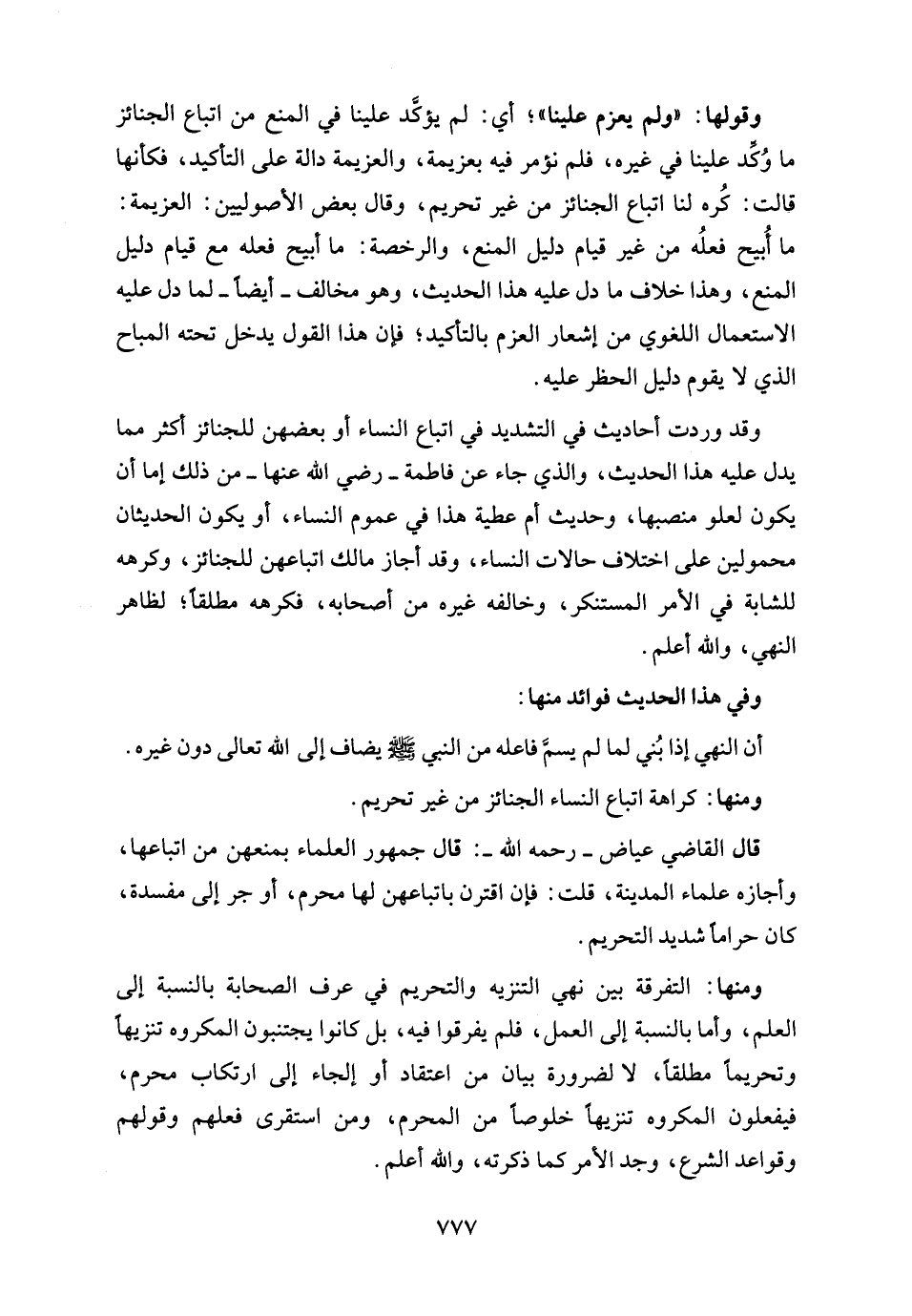 وقد وردت أحاديث في التشديد في اتباع النساء أو بعضهن للجنائز أكثر مما يدل عليه هذا الحديث، والذي جاء عن فاطمة - رضي الله عنها - من ذلك إما أن يكون لعلو منصبها، وحديث أم عطية هذا في عموم النساء، أو يكون الحديثان محمولين على اختلاف حالات النساء، وقد أجاز مالك اتباعهن للجنائز، وكرهه للشابة في الأمر المستنكر، وخالفه غيره من أصحابه، فكرهه مطلقًا؛ لظاهر النهي، والله أعلم.