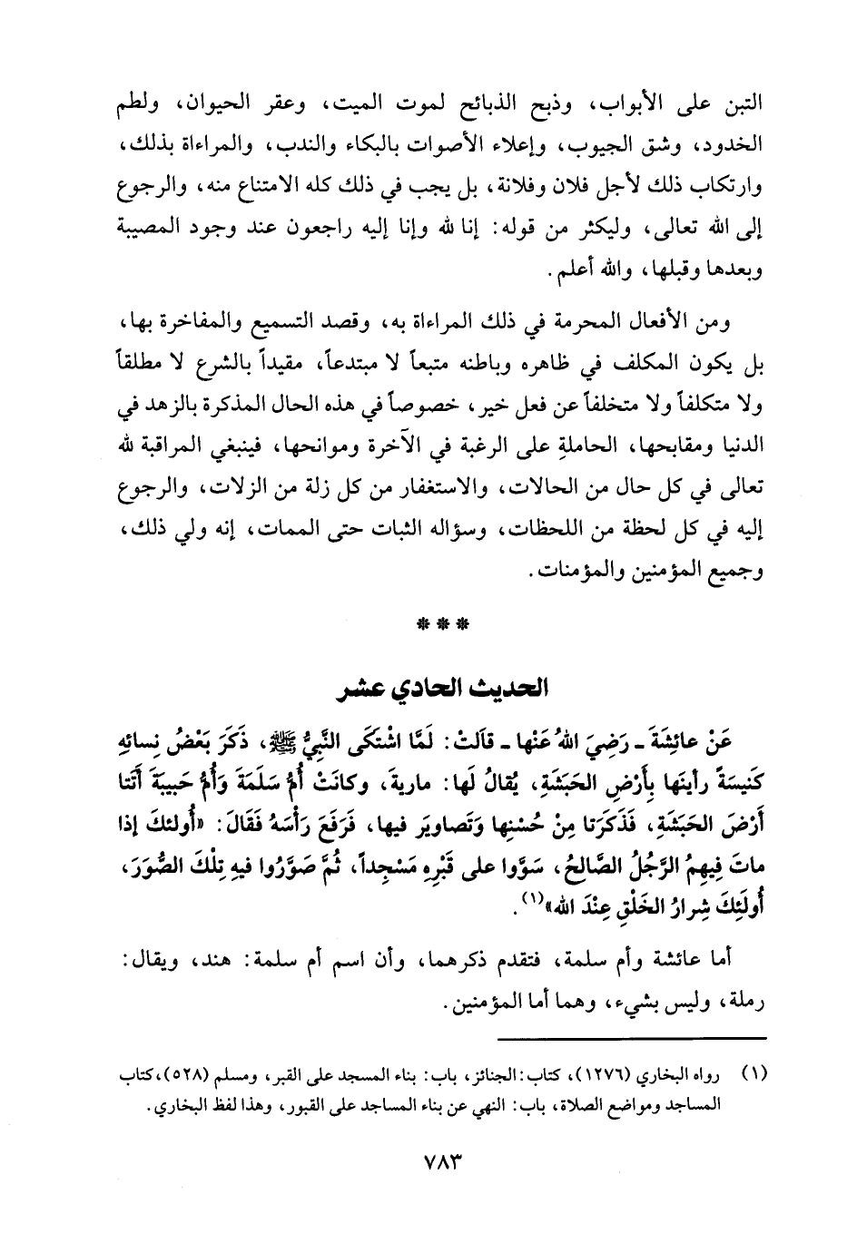 عَنْ عائشِةَ -رَضِيَ اللهُ عَنْها- قاَلت: لَمَّا اشْتَكَى النَّبِيُّ - صلى الله عليه وسلم -، ذَكَرَ بَعْضُ نِسائهِ كَنيسَةً رأينَها بِأَرْضِ الحَبَشَةِ، يُقَالُ لَها: ماريةَ، وكانَتْ أُمُّ سَلَمَةَ وَأُمُّ حَبَيبَةَ أَتَتا أَرْضَ الحَبَشَةِ، فَذَكَرَتا مِنْ حُسْنِها وَتَصاويَر فيها، فَرَفَعَ رَأسَهُ فَقَالَ: "أولئكَ إذا ماتَ فِيهِمُ الرَّجُلُ الصَّالحُ، سَوَّوا على قَبْرِهِ مَسْجِدًا، ثُمَّ صَوَّرُوا فيهِ تِلْكَ الصُّوَرَ، أولَئِكَ شِرارُ الخَلْقِ عِنْدَ الله" (¬1).