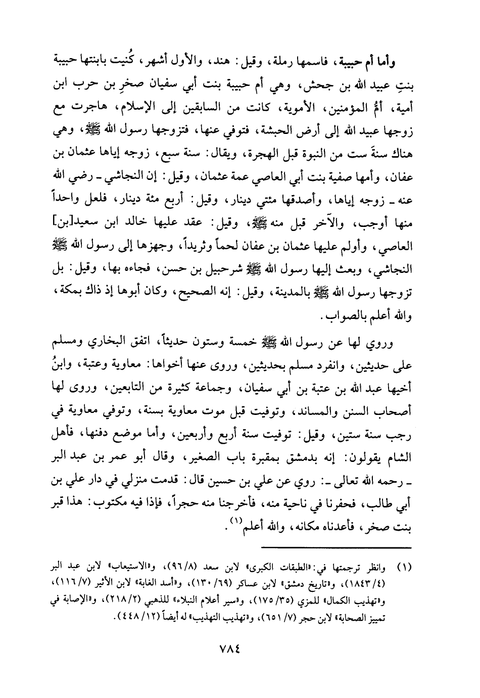وأما أم حبيبة، فاسمها رملة، وقيل: هند، والأول أشهر، كُنيت بابنتها حبيبة بنتِ عبيد الله بن جحش، وهي أم حبيبة بنت أبي سفيان صخرِ بن حرب ابن أمية، أمُّ المؤمنين، الأموية، كانت من السابقين إلى الإسلام، هاجرت مع زوجها عبيد الله إلى أرض الحبشة، فتوفي عنها، فتزوجها رسول الله - صلى الله عليه وسلم -، وهي هناك سنةَ ست من النبوة قبل الهجرة، ويقال: سنة سبع، زوجه إياها عثمان بن عفان، وأمها صفية بنت أبي العاصي عمة عثمان، وقيل: إن النجاشي -رضي الله عنه- زوجه إياها، وأصدقها مئتي دينار، وقيل: أربع مئة دينار، فلعل واحدًا منها أوجب، والآخر قبل منه - صلى الله عليه وسلم -، وقيل: عقد عليها خالد ابن سعيد [بن] العاصي، وأولم عليها عثمان بن عفان لحمًا وثريدًا، وجهزها إلى رسول الله - صلى الله عليه وسلم - النجاشي، وبعث إليها رسول الله - صلى الله عليه وسلم - شرحبيل بن حسن، فجاءه بها، وقيل: بل تزوجها رسول الله - صلى الله عليه وسلم - بالمدينة، وقيل: إنه الصحيح، وكان أبوها إذ ذاك بمكة، والله أعلم بالصواب.