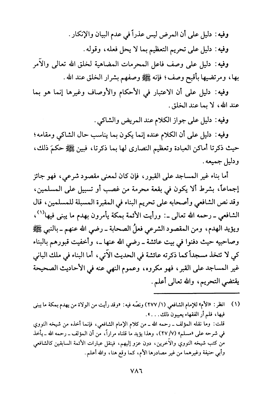 أما بناء غير المساجد على القبور، فإن كان لمعنى مقصود شرعي، فهو جائز إجماعًا، بشرط ألا يكون في بقعة محرمة من غصب أو تسبيل على المسلمين، وقد نص الشافعي وأصحابه على تحريم البناء في المقبرة المسبلة للمسلمين، قال الشافعي -رحمه الله تعالى-: ورأيت الأئمة بمكة يأمرون بهدم ما يبنى فيها (¬1)، ويؤيد الهدم، ومن المقصود الشرعي فعلُ الصحابة -رضي الله عنهم- بالنبي - صلى الله عليه وسلم - وصاحبيه حيث دفنوا في بيت عائشة - رضي الله عنها -، وأخفيت قبورهم بالبناء كي لا تتخذ مسجدًا كما ذكرته عائشة في الحديث الآتي، أما البناء في ملك الباني غير المساجد على القبر، فهو مكروه، وعموم النهي عنه في الأحاديث الصحيحة يقتضي التحريم، والله تعالى أعلم.