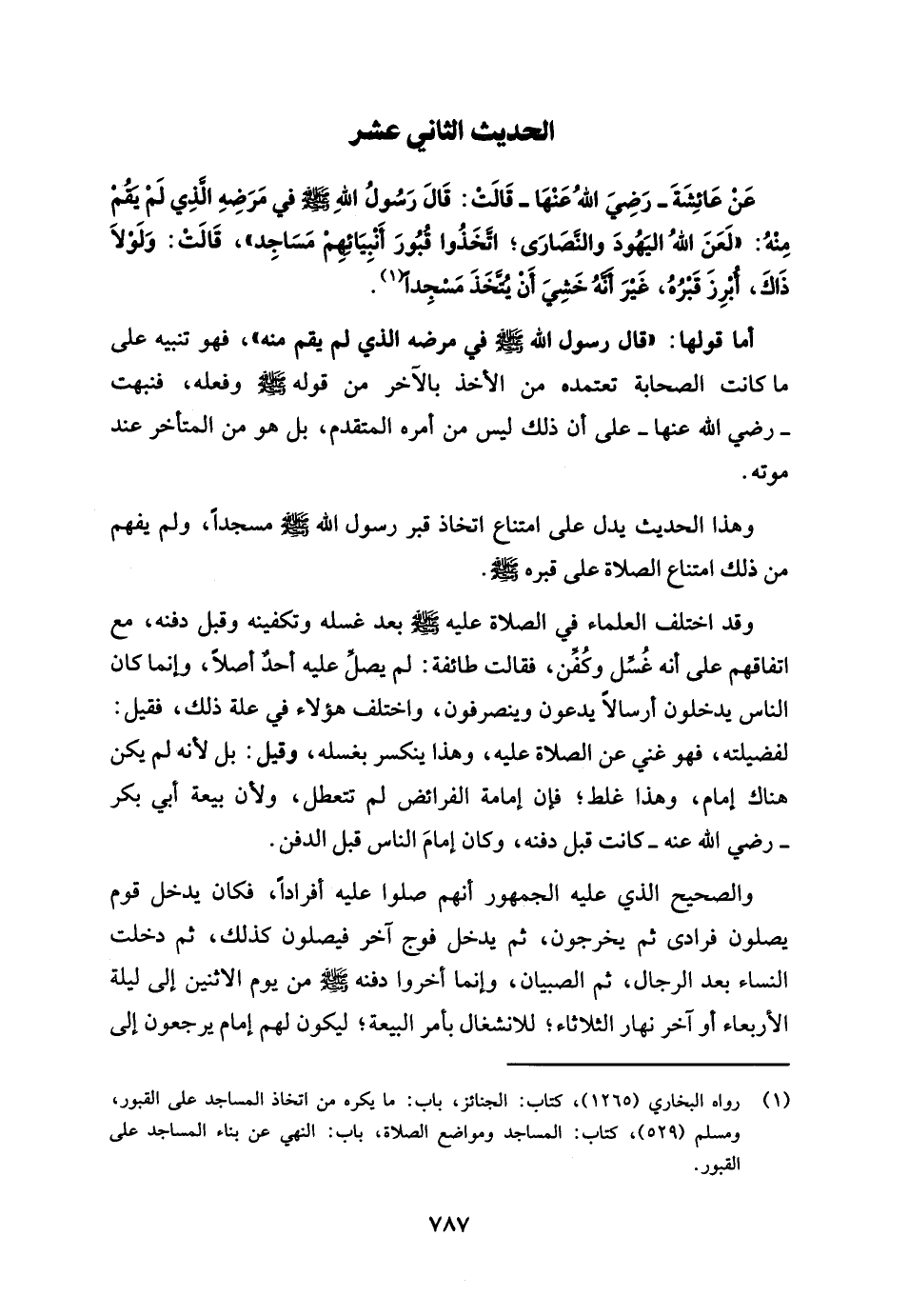 عَنْ عَائشِةَ -رَضِيَ اللهُ عَنْهَا- فَالَتْ: قَالَ رَسُولُ اللهِ - صلى الله عليه وسلم - في مَرَضِهِ الَّذِي لَمْ يَقُمْ مِنْهُ: "لَعَنَ اللهُ اليَهُودَ والنَّصَارَى؛ اتَّخَذُوا قُبُورَ أَنْبيَائهِمْ مَسَاجِد"، قَالَتْ: وَلَوْلاَ ذَاكَ، أُبْرِزَ قَبْرُهُ، غَيْرَ أنَّهُ خَشِيَ أَنْ يُتَّخَذَ مَسْجِدًا" (¬1).