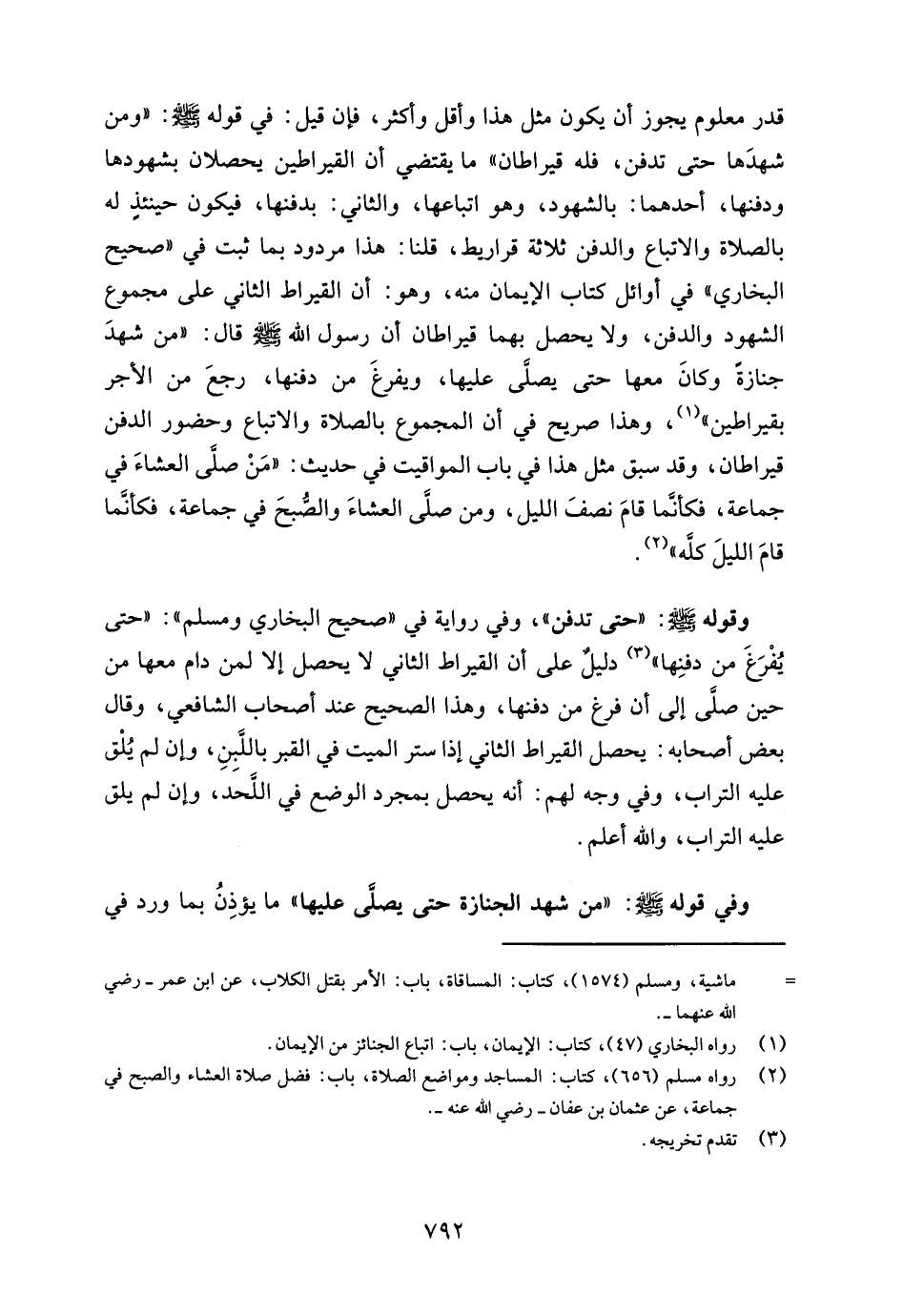 قدر معلوم يجوز أن يكون مثل هذا وأقل وأكثر، فإن قيل: في قوله - صلى الله عليه وسلم -: "ومن شهدَها حتى تدفن، فله قيراطان" ما يقتضي أن القيراطين يحصلان بشهودها ودفنها، أحدهما: بالشهود، وهو اتباعها، والثاني: بدفنها، فيكون حينئذٍ له بالصلاة والاتباع والدفن ثلاثة قراريط، قلنا: هذا مردود بما ثبت في "صحيح البخاري" في أوائل كتاب الإيمان منه، وهو: أن القيراط الثاني على مجموع الشهود والدفن، ولا يحصل بهما قيراطان أن رسول الله - صلى الله عليه وسلم - قال: "من شهدَ جنازةَ وكانَ معها حتى يصلَّى عليها، ويفرغَ من دفنها، رجعَ من الأجر بقيراطين" (¬1)، وهذا صريح في أن المجموع بالصلاة والاتباع وحضور الدفن قيراطان، وقد سبق مثل هذا في باب المواقيت في حديث: "مَنْ صلَّى العشاءَ في جماعة، فكأنَّما قامَ نصفَ الليل، ومن صَلَّى العشاءَ والصُّبحَ في جماعة، فكأنَّما قامَ الليلَ كلَّه" (¬2).