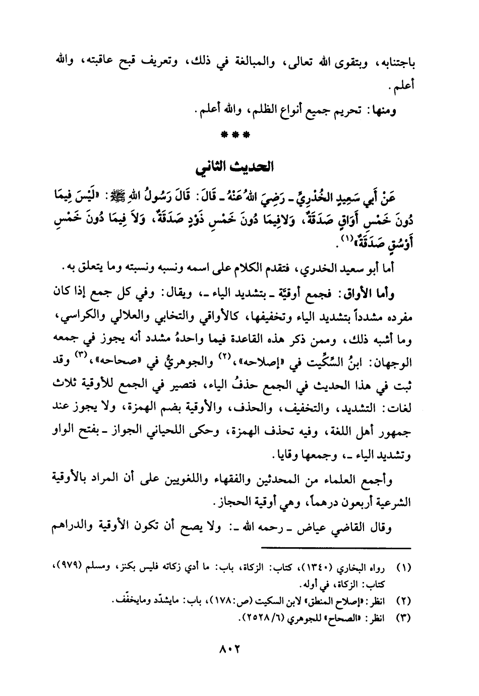 عَن أَبي سَعِيدٍ الخُدْريِّ - رَضِيَ اللهُ عَنْهُ - قَالَ: قَالَ رَسُولُ اللهِ - صلى الله عليه وسلم -: "لَيسَ فِيمَا دُونَ خَمْسِ أَوَاقٍ صَدَقَةٌ، وَلا فِيمَا دُونَ خَمْسِ ذَوْدٍ صَدَقَةٌ، وَلَا فِيمَا دُونَ خَمْسِ أَوْسُقٍ صَدَقَةٌ" (¬1).