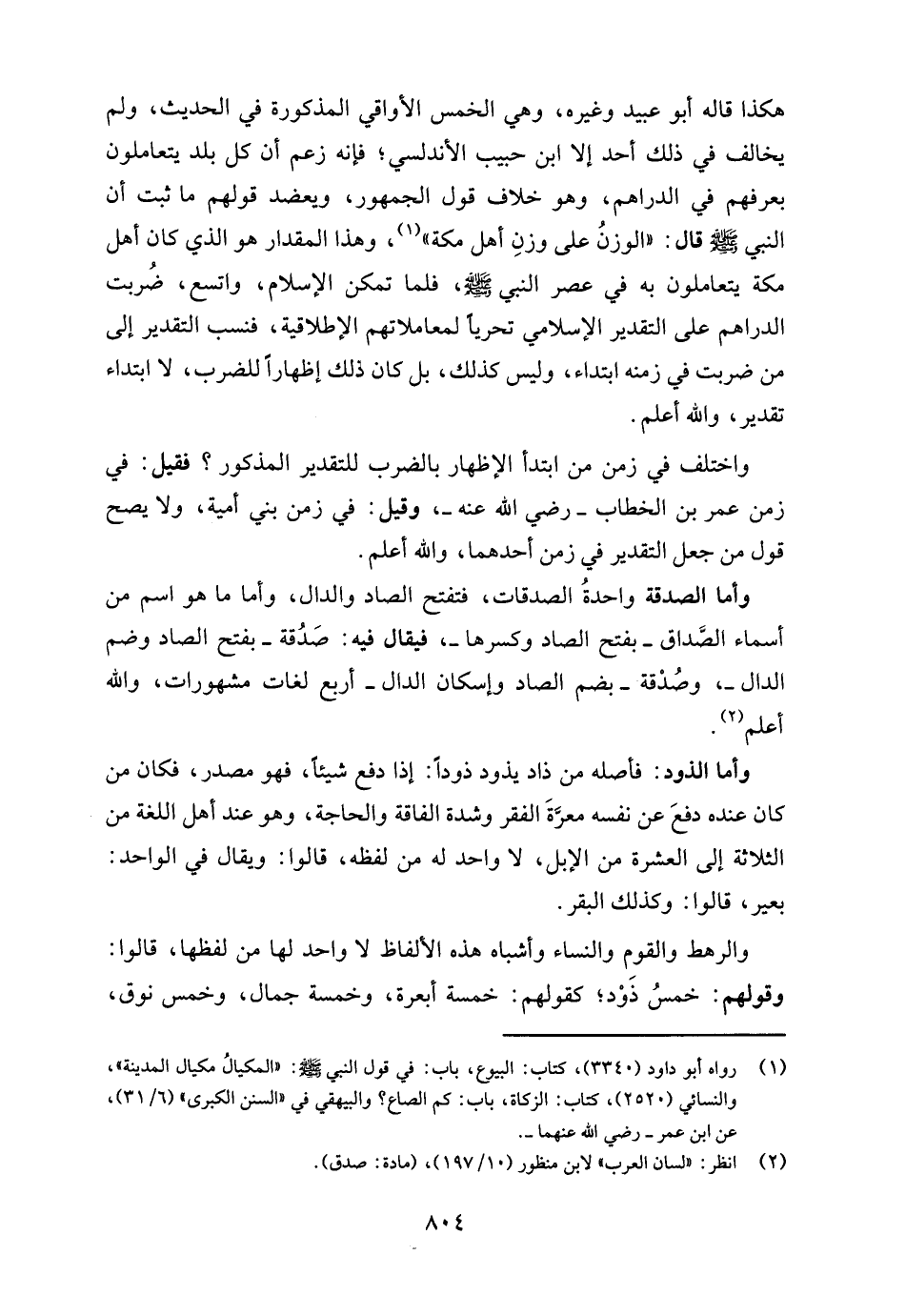 هكذا قاله أبو عبيد وغيره، وهي الخمس الأواقي المذكورة في الحديث، ولم يخالف في ذلك أحد إلا ابن حبيب الأندلسي؛ فإنه زعم أن كل بلد يتعاملون بعرفهم في الدراهم، وهو خلاف قول الجمهور، ويعضد قولهم ما ثبت أن النبي - صلى الله عليه وسلم - قال: "الوزنُ على وزنِ أهل مكة" (¬1)، وهذا المقدار هو الَّذي كان أهل مكة يتعاملون به في عصر النبي - صلى الله عليه وسلم -، فلما تمكن الإسلام، واتسع، ضُربت الدراهم على التقدير الإسلامي تحريًّا لمعاملاتهم الإطلاقية، فنسب التقدير إلى من ضربت في زمنه ابتداء، وليس كذلك، بل كان ذلك إظهارًا للضرب، لا ابتداء تقدير، والله أعلم.