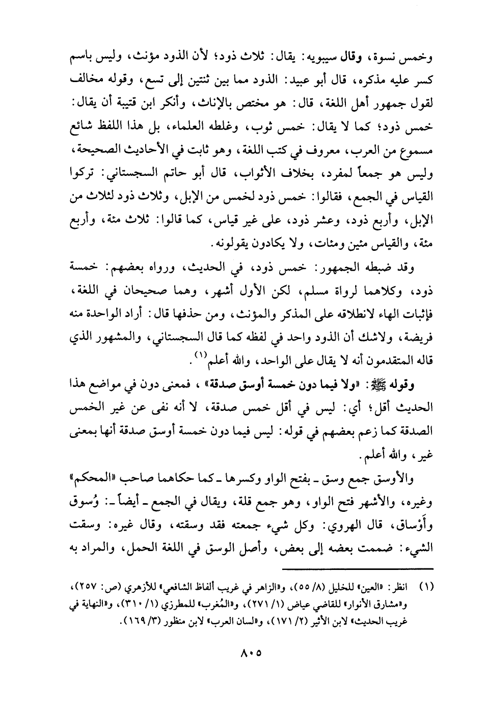 وقد ضبطه الجمهور: خمس ذود، في الحديث، ورواه بعضهم: خمسة ذود، وكلاهما لرواة مسلم، لكن الأول أشهر، وهما صحيحان في اللغة، فإثبات الهاء لانطلاقه على المذكر والمؤنث، ومن حذفها قال: أراد الواحدة منه فريضة، ولا شك أن الذود واحد في لفظه كما قال السجستاني، والمشهور الَّذي قاله المتقدمون أنه لا يقال على الواحد، والله أعلم (¬1).