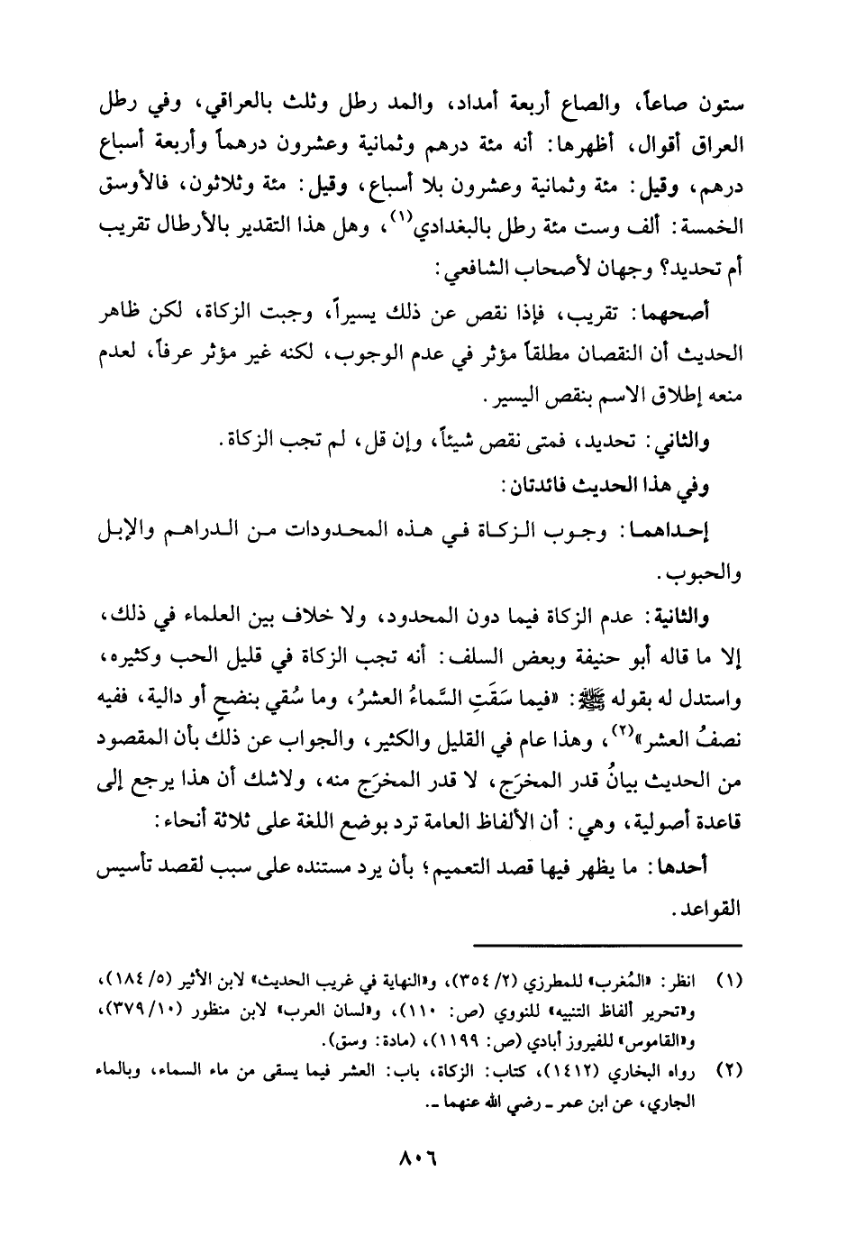 والثانية: عدم الزكاة فيما دون المحدود، ولا خلاف بين العلماء في ذلك، إلا ما قاله أبو حنيفة وبعض السلف: أنه تجب الزكاة في قليل الحب وكثيره، واستدل له بقوله - صلى الله عليه وسلم -: "فيما سَقَتِ السَّماءُ العشرُ، وما سُقي بنضحٍ أو دالية، ففيه نصفُ العشر" (¬2)، وهذا عام في القليل والكثير، والجواب عن ذلك بأن المقصود من الحديث بيانُ قدر المخرَج، لا قدر المخرَج منه، ولا شك أن هذا يرجع إلى قاعدة أصولية، وهي: أن الألفاظ العامة ترد بوضع اللغة على ثلاثة أنحاء: