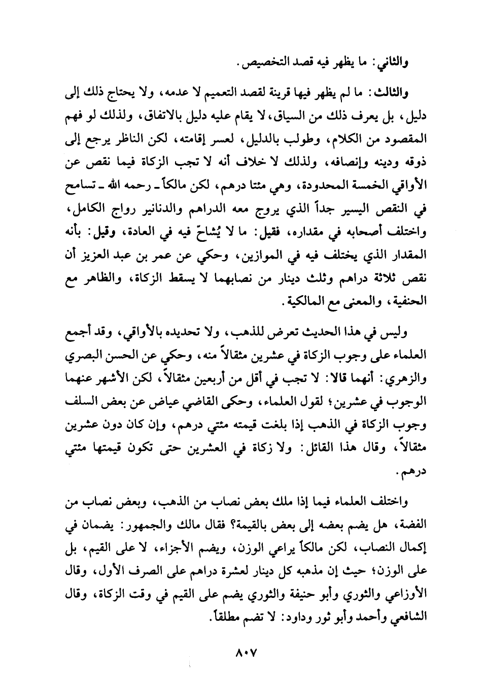 والثالث: ما لم يظهر فيها قرينة لقصد التعميم لا عدمه، ولا يحتاج ذلك إلى دليل، بل يعرف ذلك من السياق، لا يقام عليه دليل بالاتفاق، ولذلك لو فهم المقصود من الكلام، وطولب بالدليل، لعسر إقامته، لكن الناظر يرجع إلى ذوقه ودينه وإنصافه، ولذلك لا خلاف أنه لا تجب الزكاة فيما نقص عن الأواقي الخمسة المحدودة، وهي مئتا درهم، لكن مالكًا - رحمه الله - تسامح في النقص اليسير جدًّا الذي يروج معه الدراهم والدنانير رواج الكامل، واختلف أصحابه في مقداره، فقبل: ما لا يُشاحّ فيه في العادة، وقيل: بأنه المقدار الَّذي يختلف فيه في الموازين، وحكي عن عمر بن عبد العزيز أن نقص ثلاثة دراهم وثلث دينار من نصابهما لا يسقط الزكاة، والظاهر مع الحنفية، والمعنى مع المالكية.