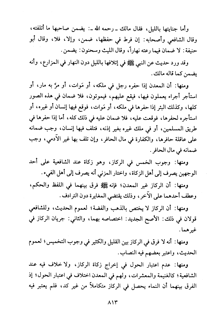 ومنها: عدم اعتبار الحول في إخراج زكاة الركاز، ولا خلاف فيه عند الشافعية؛ كالغنيمة والمعشرات، ولهم في المعدن اختلاف في اعتبار الحول؛ إذ الفرق بينهما أن النماء يحصل في الركاز متكاملًا من غير كد، فلم يعتبر فيه