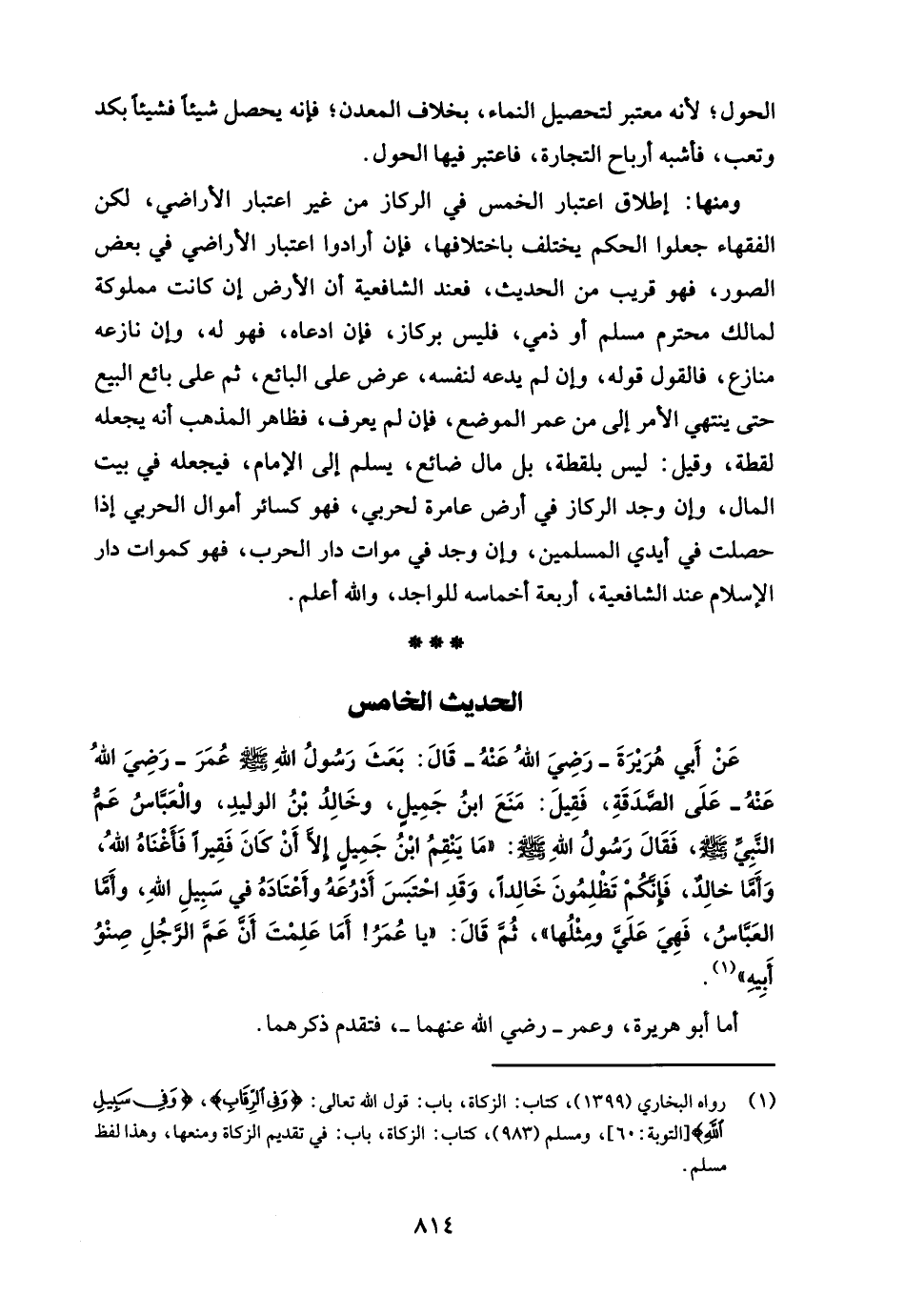 عَنْ أَبِي هُرَيْرَةَ - رَضِيَ اللهُ عَنْهُ - قَالَ: بَعَثَ رَسُولُ اللهِ - صلى الله عليه وسلم - عُمَرَ - رَضِيَ اللهُ عَنْهُ - عَلَى الصَّدَقَةِ، فَقِيلَ: مَنَعَ ابنُ جَمِيلٍ، وخَالِدُ بْنُ الولِيدِ، والْعَبَّاسُ عَمُّ النَّبِيِّ - صلى الله عليه وسلم -، فَقَالَ رَسُولُ اللهِ - صلى الله عليه وسلم -: "مَا يَنْقِمُ ابْنُ جَمِيلٍ إلا أَنْ كَانَ فَقِيرًا فَأَغْنَاهُ اللهُ، وَأَمَّا خالِدٌ، فَإِنَّكُمْ تَظْلِمُونَ خَالِدًا، وَقَدِ احْتبَسَ أَدْرُعَهُ وأَعْتَادَهُ في سَبِيلِ اللهِ، وأَمَّا العَبَّاسُ، فَهِيَ عَلَيَّ ومِثْلُها"، ثُمَّ قَالَ: "يا عُمَرُ! أَمَا عَلِمْتَ أَنَّ عَمَّ الرَّجُلِ صِنْوُ أَبِيهِ" (¬1).