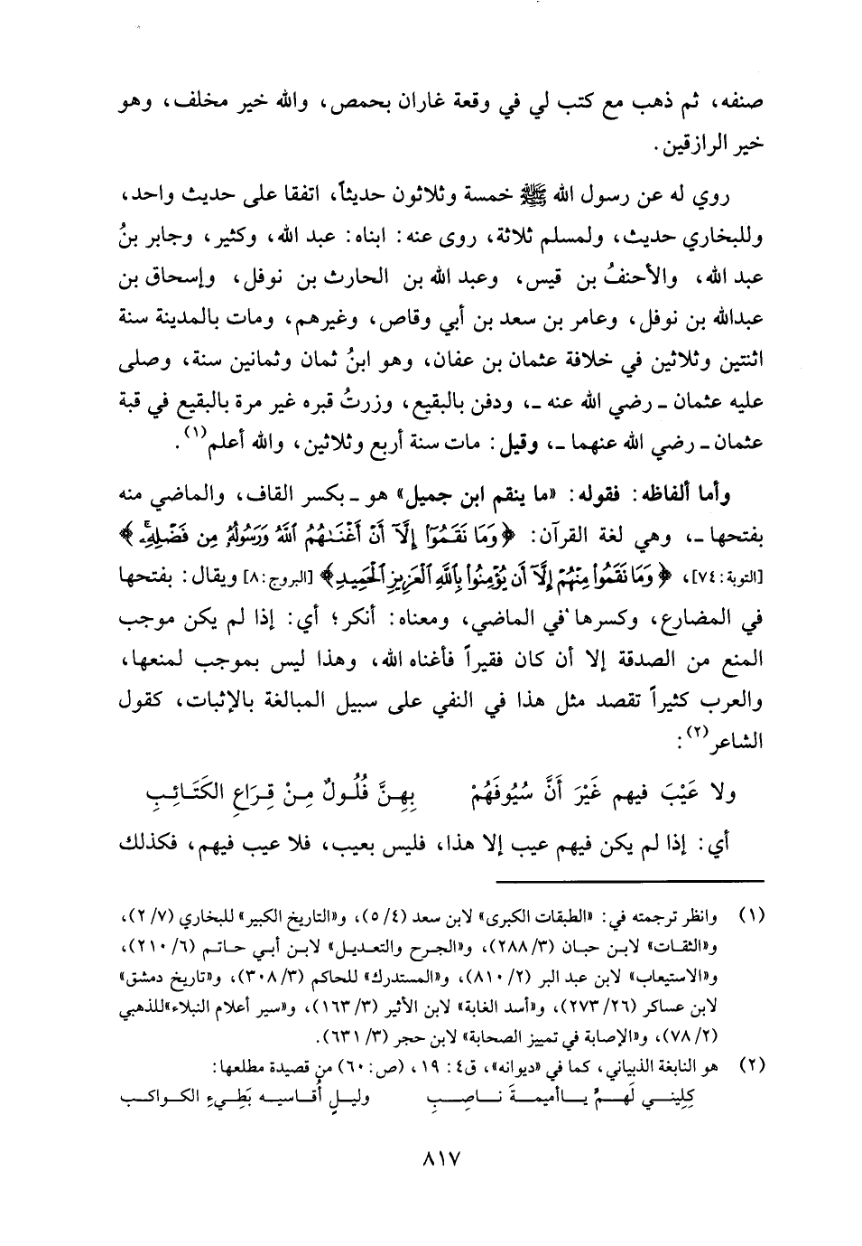 وأما ألفاظه: فقوله: "ما ينقم ابن جميل" هو -بكسر القاف، والماضي منه بفتحها-، وهي لغة القرآن: {وَمَا نَقَمُوا إلا أَنْ أَغْنَاهُمُ اللَّهُ وَرَسُولُهُ مِنْ فَضْلِهِ} [التوبة: 74]، {وَمَا نَقَمُوا مِنْهُمْ إلا أَنْ يُؤْمِنُوا بِاللَّهِ الْعَزِيزِ الْحَمِيدِ} [البروج: 8] ويقال: بفتحها في المضارع، وكسرها في الماضي، ومعناه: أنكر؛ أي: إذا لم يكن موجب المنع من الصدقة إلا أن كان فقيرًا فأغناه الله، وهذا ليس بموجب لمنعها، والعرب كثيرًا تقصد مثل هذا في النفي على سبيل المبالغة بالإثبات، كقول الشاعر (¬2):