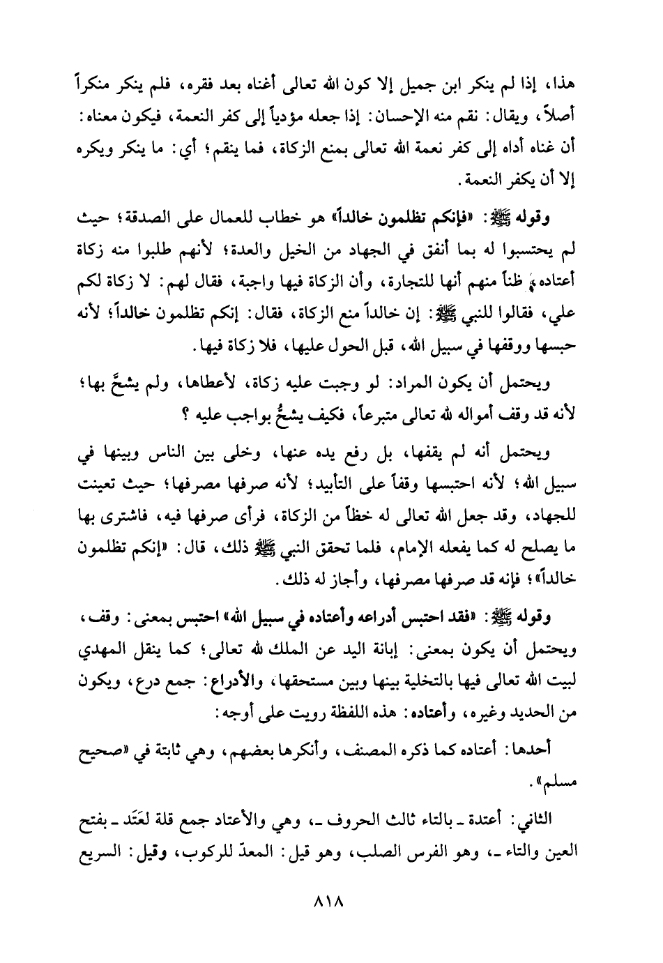 ويحتمل أنه لم يقفها، بل رفع يده عنها، وخلى بين الناس وبينها في سبيل الله؛ لأنه احتبسها وقفًا على التأبيد؛ لأنه صرفها مصرفها؛ حيث تعينت للجهاد، وقد جعل الله تعالى له حظًّا من الزكاة، فرأى صرفها فيه، فاشترى بها ما يصلح له كما يفعله الإمام، فلما تحقق النبي - صلى الله عليه وسلم - ذلك، قال: "إنكم تظلمون خالدًا"؛ فإنه قد صرفها مصرفها، وأجاز له ذلك.