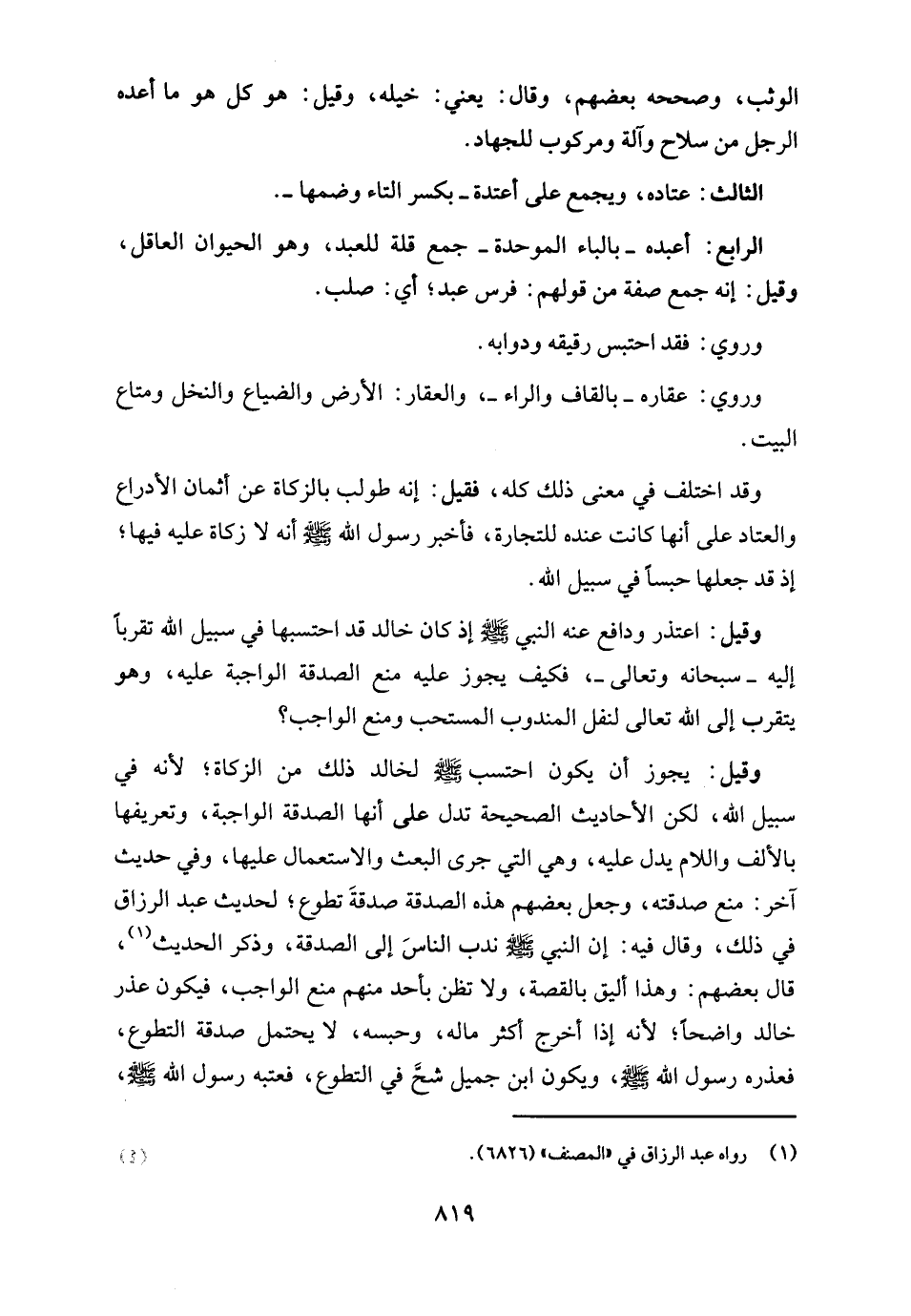 وقيل: يجوز أن يكون احتسب - صلى الله عليه وسلم - لخالد ذلك من الزكاة؛ لأنه في سبيل الله، لكن الأحاديث الصحيحة تدل على أنها الصدقة الواجبة، وتعريفها بالألف واللام يدل عليه، وهي التي جرى البعث والاستعمال عليها، وفي حديث آخر: منع صدقته، وجعل بعضهم هذه الصدقة صدقةَ تطوع؛ لحديث عبد الرزاق في ذلك، وقال فيه: إن النبي - صلى الله عليه وسلم - ندب الناسَ إلى الصدقة، وذكر الحديث (¬1)، قال بعضهم: وهذا أليق بالقصة، ولا تظن بأحد منهم منع الواجب، فيكون عذر خالد واضحًا؛ لأنه إذا أخرج أكثر ماله، وحبسه، لا يحتمل صدقة التطوع، فعذره رسول الله - صلى الله عليه وسلم -، ويكون ابن جميل شحَّ في التطوع، فعتبه رسول الله - صلى الله عليه وسلم -،