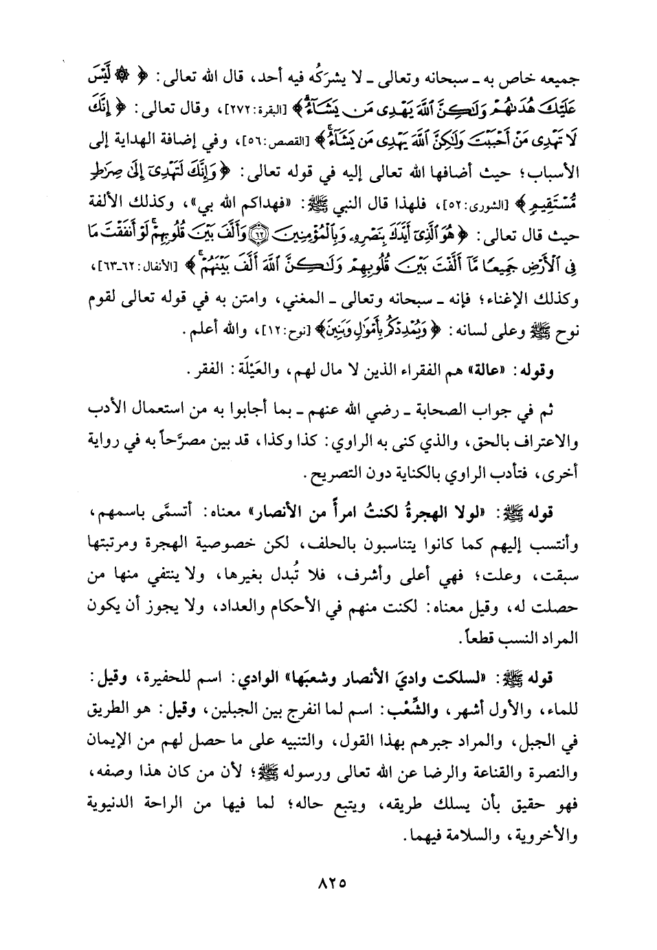 قوله - صلى الله عليه وسلم -: "لسلكت واديَ الأنصار وشعبَها" الوادي: اسم للحفيرة، وقيل: للماء، والأول أشهر، والشِّعْب: اسم لما انفرج بين الجبلين، وقيل: هو الطريق في الجبل، والمراد جبرهم بهذا القول، والتنبيه على ما حصل لهم من الإيمان والنصرة والقناعة والرضا عن الله تعالى ورسوله - صلى الله عليه وسلم -؛ لأن من كان هذا وصفه، فهو حقيق بأن يسلك طريقه، ويتبع حاله؛ لما فيها من الراحة الدنيوية والأخروية، والسلامة فيهما.