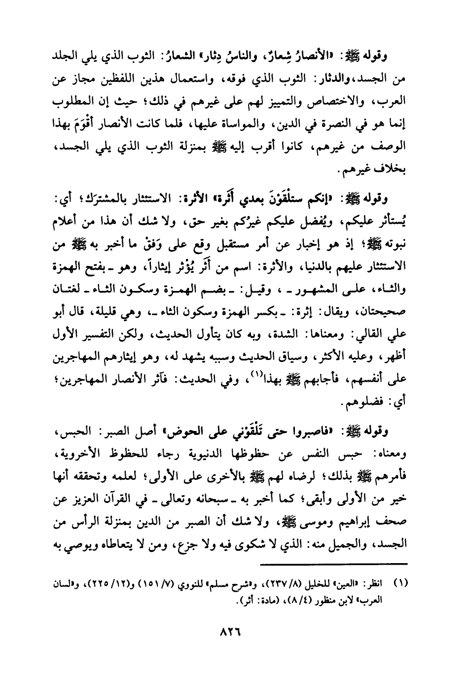 وقوله - صلى الله عليه وسلم -: "الأنصارُ شِعارٌ، والنَّاسُ دِثار" الشعارُ: الثوب الَّذي يلي الجلد من الجسد، والدثار: الثوب الَّذي فوقه، واستعمال هذين اللفظين مجاز عن العرب، والاختصاص والتمييز لهم على غيرهم في ذلك؛ حيث إن المطلوب إنما هو في النصرة في الدين، والمواساة عليها، فلما كانت الأنصار أقْوَمَ بهذا الوصف من غيرهم، كانوا أقرب إليه - صلى الله عليه وسلم - بمنزلة الثوب الَّذي يلي الجسد، بخلاف غيرهم.