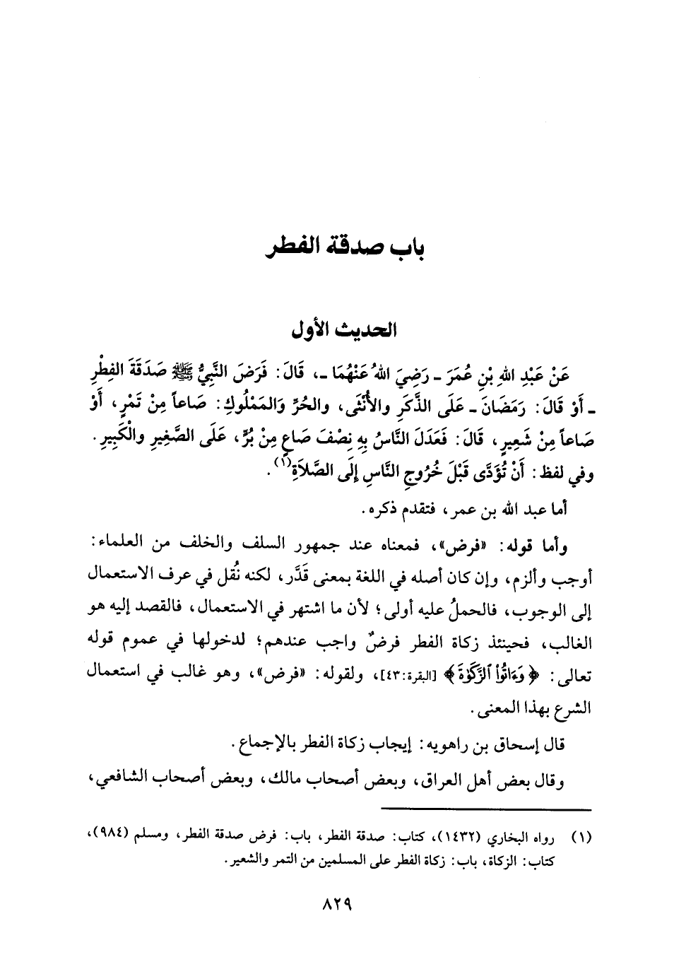عَنْ عَبْدِ اللهِ بْنِ عُمَرَ - رَضِيَ اللهُ عَنْهُمَا -، قَالَ: فَرَضَ النَّبِيُّ - صلى الله عليه وسلم - صَدَقَةَ الفِطْرِ -أَوْ قَالَ: رَمَضَانَ- عَلَى الذَّكَرِ والأُنْثَى، والحُرِّ وَالمَمْلُوكِ: صَاعًا مِنْ تَمْرٍ، أَوْ صَاعًا مِنْ شَعِيرٍ، قَالَ: فَعَدَلَ النَّاسُ بِهِ نِصْفَ صَاع مِنْ بُرٍّ، عَلَى الصَّغِيرِ والْكَبِيرِ.