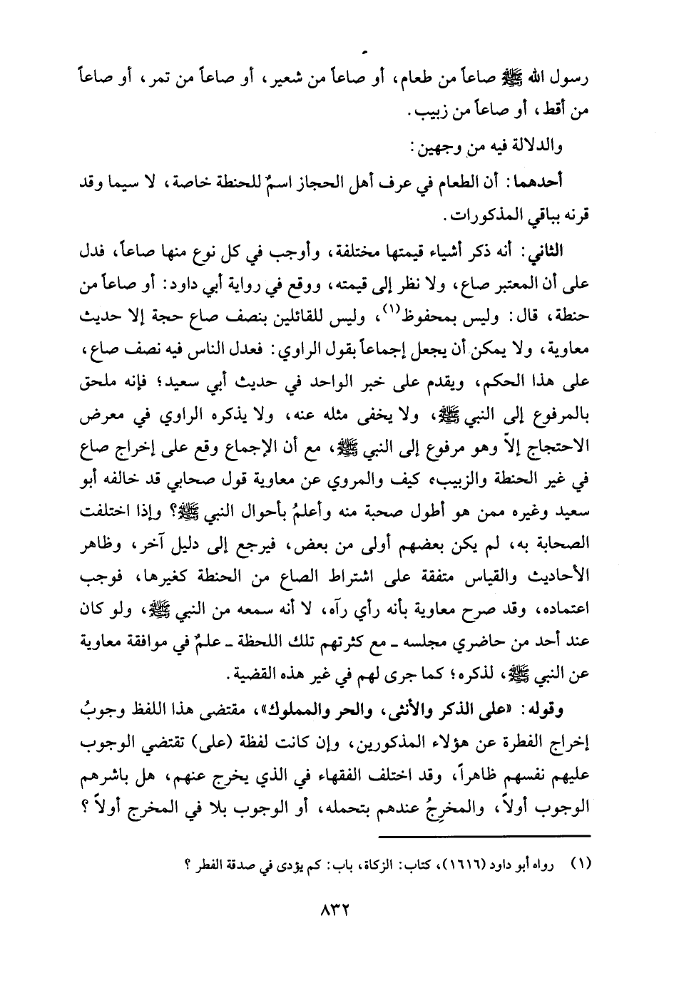 الثاني: أنه ذكر أشياء قيمتها مختلفة، وأوجب في كل نوع منها صاعًا، فدل على أن المعتبر صاع، ولا نظر إلى قيمته، ووقع في رواية أبي داود: أو صاعًا من حنطة، قال: وليس بمحفوظ (¬1)، وليس للقائلين بنصف صاع حجة إلا حديث معاوية، ولا يمكن أن يجعل إجماعًا بقول الراوي: فعدل الناس فيه نصف صاع، على هذا الحكم، ويقدم على خبر الواحد في حديث أبي سعيد؛ فإنه ملحق بالمرفوع إلى النبي - صلى الله عليه وسلم -، ولا يخفى مثله عنه، ولا يذكره الراوي في معرض الاحتجاج إلّا وهو مرفوع إلى النبي - صلى الله عليه وسلم -، مع أن الإجماع وقع على إخراج صاع في غير الحنطة والزبيب؛ كيف والمروي عن معاوية قول صحابي قد خالفه أبو سعيد وغيره ممن هو أطول صحبة منه وأعلمُ بأحوال النبي - صلى الله عليه وسلم -؟ وإذا اختلفت الصحابة به، لم يكن بعضهم أولى من بعض، فيرجع إلى دليل آخر، وظاهر الأحاديث والقياس متفقة على اشتراط الصاع من الحنطة كغيرها، فوجب اعتماده، وقد صرح معاوية بأنه رأي رآه، لا أنه سمعه من النبي - صلى الله عليه وسلم -، ولو كان عند أحد من حاضري مجلسه -مع كثرتهم تلك اللحظة- علمٌ في موافقة معاوية عن النبي - صلى الله عليه وسلم -، لذكره؛ كما جرى لهم في غير هذه القضية.