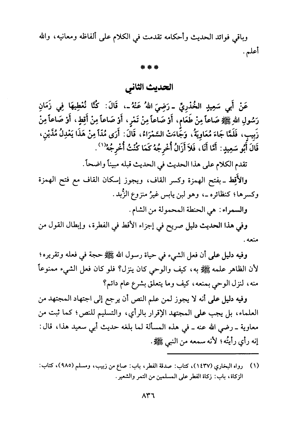 عَنْ أَبِي سَعِيدٍ الخُدْرِيِّ - رَضِيَ اللهُ عَنْهُ -، قَالَ: كُنَّا نُعْطِيهَا في زَمَانِ رَسُولِ اللهِ - صلى الله عليه وسلم - صَاعًا مِنْ طَعَامٍ، أَوْ صَاعًا مِنْ تَمْرٍ، أَوْ صَاعًا مِنْ أَقِطٍ، أَوْ صَاعًا مِنْ زَبِيبٍ، فَلَمَّا جَاءَ مُعَاوِيَّةُ، وَجَاءَتْ السَّمْرَاءُ، قَالَ: أَرَى مُدًّا مِنْ هَذَا يَعْدِلُ مُدَّيْنِ، قَالَ أَبُو سَعِيدٍ: أَمَّا أَنَا، فَلَا أَزَالُ أُخْرِجُهُ كَمَا كُنْتُ أُخْرِجُهُ (¬1).