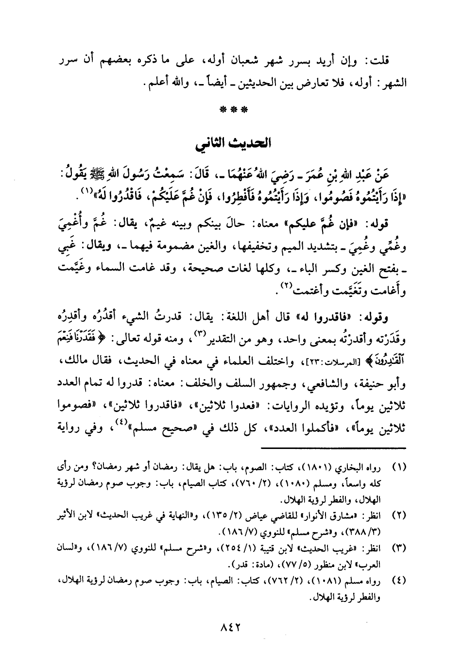 عَنْ عَبْدِ اللهِ بْنِ عُمَرَ - رَضِيَ اللهُ عَنْهُمَا -، قَالَ: سَمِعْتُ رَسُولَ اللهِ - صلى الله عليه وسلم - يقُولُ: "إذَا رَأَيْتُمُوهُ فَصُومُوا، وَإذَا رَأَيْتُمُوهُ فَأَفْطِرُوا، فَإنْ غُمَّ عَلَيْكُمْ، فَأَقْدُرُوا لَهُ" (¬1).