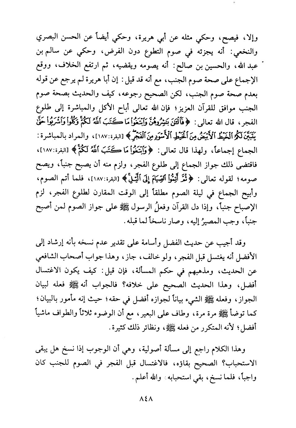 وإلا، فيصح، وحكي مثله عن أبي هريرة، وحكي أيضًا عن الحسن البصري والنخعي: أنه يجزئه في صوم التطوع دون الفرض، وحكي عن سالم بن عبد الله، والحسين بن صالح: أنه يصومه ويقضيه، ثم ارتفع الخلاف، ووقع الإجماع على صحة صوم الجنب، مع أنه قد قيل: إن أبا هريرة لم يرجع عن قوله بعدم صحة صوم الجنب، لكن الصحيح رجوعه، كيف والحديث بصحة صوم الجنب موافق للقرآن العزيز؛ فإن الله تعالى أباح الأكل والمباشرة إلى طلوع الفجر، قال الله تعالى: {فَالْآنَ بَاشِرُوهُنَّ وَابْتَغُوا مَا كَتَبَ اللَّهُ لَكُمْ وَكُلُوا وَاشْرَبُوا حَتَّى يَتَبَيَّنَ لَكُمُ الْخَيْطُ الْأَبْيَضُ مِنَ الْخَيْطِ الْأَسْوَدِ مِنَ الْفَجْرِ} [البقرة: 187]، والمراد بالمباشرة: الجماع إجماعًا، ولهذا قال تعالى: {وَابْتَغُوا مَا كَتَبَ اللَّهُ لَكُمْ} [البقرة:187]، فاقتضى ذلك جواز الجماع إلى طلوع الفجر، ولزم منه أن يصبح جنبًا، ويصح صومه؛ لقوله تعالى: {ثُمَّ أَتِمُّوا الصِّيَامَ إِلَى اللَّيْلِ} [البقرة: 187]، فلما أتم الصوم، وأبيح الجماع في ليلة الصوم مطلقًا إلى الوقت المقارن لطلوع الفجر، لزم الإصباح جنبًا، وإذا دل القرآن وفعلُ الرسول - صلى الله عليه وسلم - على جواز الصوم لمن أصبح جنبًا، وجب المصيرُ إليه، وصار ناسخًا لما قبله.