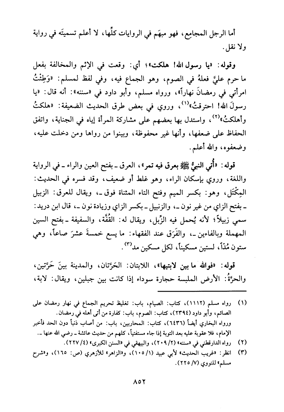 وقوله: "يا رسول الله! هلكت"؛ أي: وقعت في الإثم والمخالفة بفعل ما حرم علي فعلهُ في الصوم، وهو الجماع فيه، وفي لفظ لمسلم: "وَطِئْتُ امرأتي في رمضانَ نهارًا"، ورواه مسلم، وأبو داود في "سننه": أنه قال: "يا رسولَ الله! احترقتُ" (¬1)، وروي في بعض طرق الحديث الضعيفة: "هلكتُ وأهلكتُ" (¬2)، واستدل بها بعضهم على مشاركة المرأة إياه في الجناية، واتفق الحفاظ على ضعفها، وأنها غير محفوظة، وبينوا من رواها ومن دخلت عليه، وضعفوه، والله أعلم.