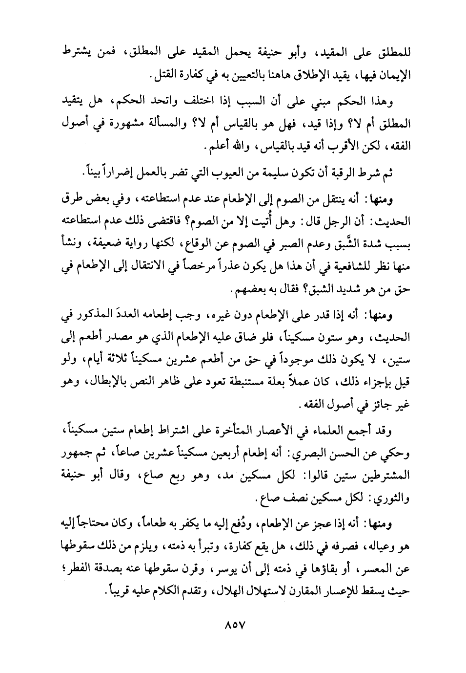 وقد أجمع العلماء في الأعصار المتأخرة على اشتراط إطعام ستين مسكينًا، وحكي عن الحسن البصري: أنه إطعام أربعين مسكينًا عشرين صاعًا، ثم جمهور المشترطين ستين قالوا: لكل مسكين مد، وهو ربع صاع، وقال أبو حنيفة والثوري: لكل مسكين نصف صاع.