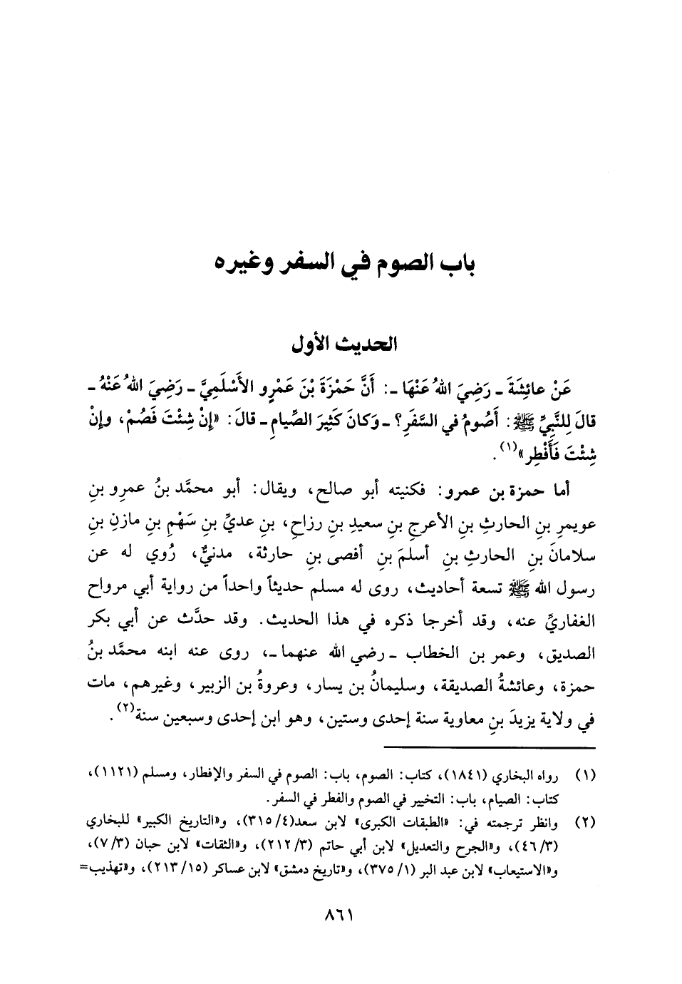 عَنْ عائشِةَ - رَضِيَ اللهُ عَنْهَا -: أَنَّ حَمْزَةَ بْنَ عَمْرٍو الأَسْلَمِيَّ - رَضِيَ اللهُ عَنْهُ - قالَ لِلنَّبِيِّ - صلى الله عليه وسلم -: أَصُومُ في السَّفَرِ؟ -وَكانَ كَثِيرَ الصِّيامِ- قالَ: "إِنْ شِئْتَ فَصُمْ، وإنْ شِئْتَ فَأَفْطِر" (¬1).