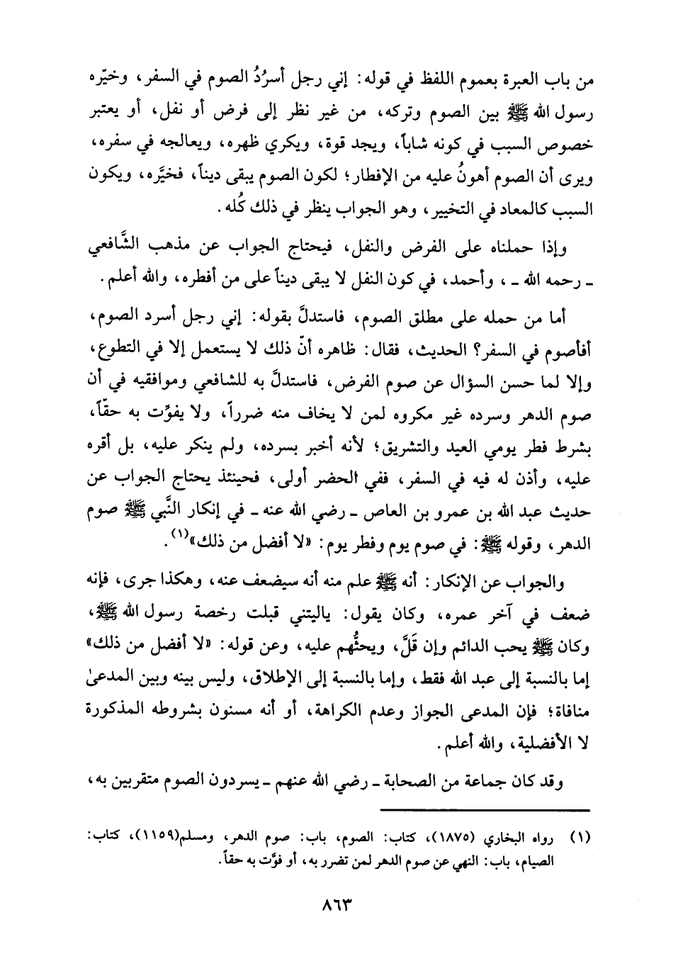 أما من حمله على مطلق الصوم، فاستدلَّ بقوله: إني رجل أسرد الصوم، أفأصوم في السفر؟ الحديث، فقال: ظاهره أن ذلك لا يستعمل إلا في التطوع، وإلا لما حسن السؤال عن صوم الفرض، فاستدلَّ به للشافعي وموافقيه في أن صوم الدهر وسرده غير مكروه لمن لا يخاف منه ضررًا، ولا يفوِّت به حقًّا، بشرط فطر يومي العيد والتشريق؛ لأنه أخبر بسرده، ولم ينكر عليه، بل أقره عليه، وأذن له فيه في السفر، ففي الحضر أولى، فحينئذ يحتاج الجواب عن حديث عبد الله بن عمرو بن العاص - رضي الله عنه - في إنكار النَّبي - صلى الله عليه وسلم - صوم الدهر، وقوله - صلى الله عليه وسلم -: في صوم يوم وفطر يوم: "لا أفضل من ذلك" (¬1).