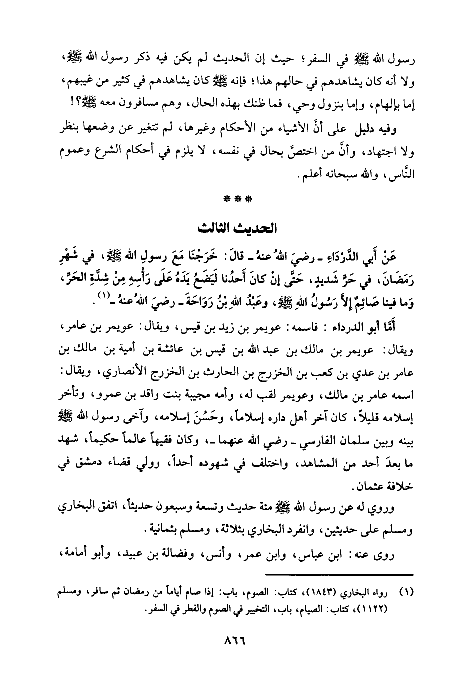 عَنْ أَبي الدَّرْدَاءِ - رضيَ اللهُ عنهُ - قالَ: خَرَجْنَا مَعَ رسولِ الله - صلى الله عليه وسلم -، في شَهْرِ رَمَضَانَ، في حَرٍّ شَديدٍ، حَتَّى إنْ كانَ أَحدُنا لَيَضَعُ يَدَهُ عَلَى رَأْسِهِ مِنْ شِدَّةِ الحَرِّ، وَما فينا صَائِمٌ إلا رَسُولُ اللهِ - صلى الله عليه وسلم -، وعَبْدُ اللهِ بْنُ رَوَاحَةَ - رضيَ اللهُ عنهُ - (¬1).