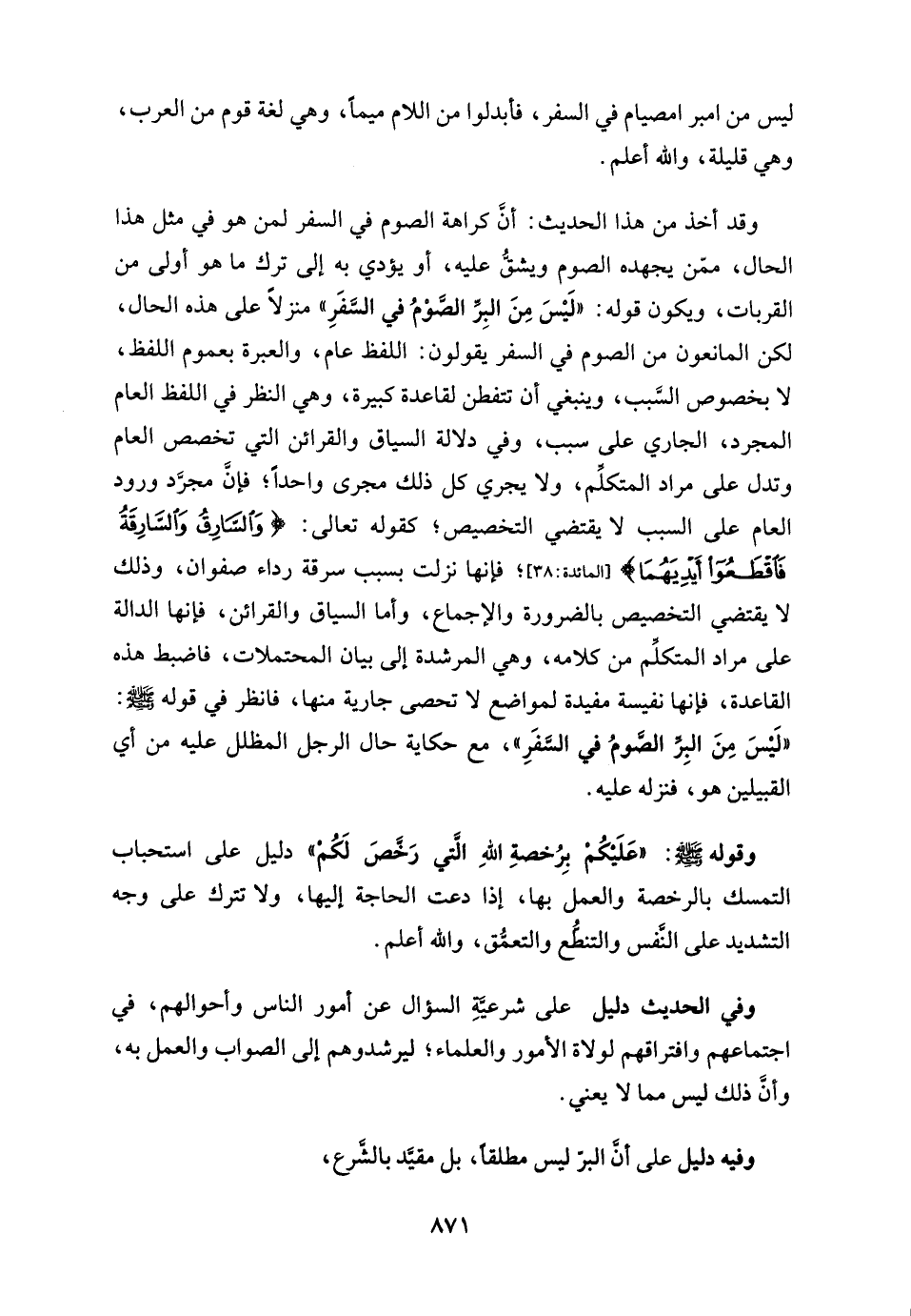 وقد أخذ من هذا الحديث: أنَّ كراهة الصوم في السفر لمن هو في مثل هذا الحال، ممّن يجهده الصوم ويشق عليه، أو يؤدي به إلى ترك ما هو أولى من القربات، ويكون قوله: "لَيْسَ مِنَ البِرِّ الصَّوْمُ في السَّفَرِ" منزلًا على هذه الحال، لكن المانعون من الصوم في السفر يقولون: اللفظ عام، والعبرة بعموم اللفظ، لا بخصوص السَّبب، وينبغي أن تتفطن لقاعدة كبيرة، وهي النظر في اللفظ العام المجرد، الجاري على سبب، وفي دلالة السياق والقرائن التي تخصص العام وتدل على مراد المتكلِّم، ولا يجري كل ذلك مجرى واحدًا؛ فإنَّ مجرَّد ورود العام على السبب لا يقتضي التخصيص؛ كقوله تعالى: {وَالسَّارِقُ وَالسَّارِقَةُ فَاقْطَعُوا أَيْدِيَهُمَا جَزَاءً بِمَا كَسَبَا نَكَالًا مِنَ اللَّهِ وَاللَّهُ عَزِيزٌ حَكِيمٌ (38)} [المائدة: 38] {وَالسَّارِقُ وَالسَّارِقَةُ فَاقْطَعُوا أَيْدِيَهُمَا} [المائدة:38]؛ فإنها نزلت بسبب سرقة رداء صفوان، وذلك لا يقتضي التخصيص بالضرورة والإجماع، وأما السياق والقرائن، فإنها الدالة على مراد المتكلِّم من كلامه، وهي المرشدة إلى بيان المحتملات، فاضبط هذه القاعدة، فإنها نفيسة مفيدة لمواضع لا تحصى جارية منها، فانظر في قوله - صلى الله عليه وسلم -: "لَيْسَ مِنَ البِرِّ الصَّومُ في السَّفَرِ"، مع حكاية حال الرجل المظلل عليه من أي القبيلين هو، فنزله عليه.