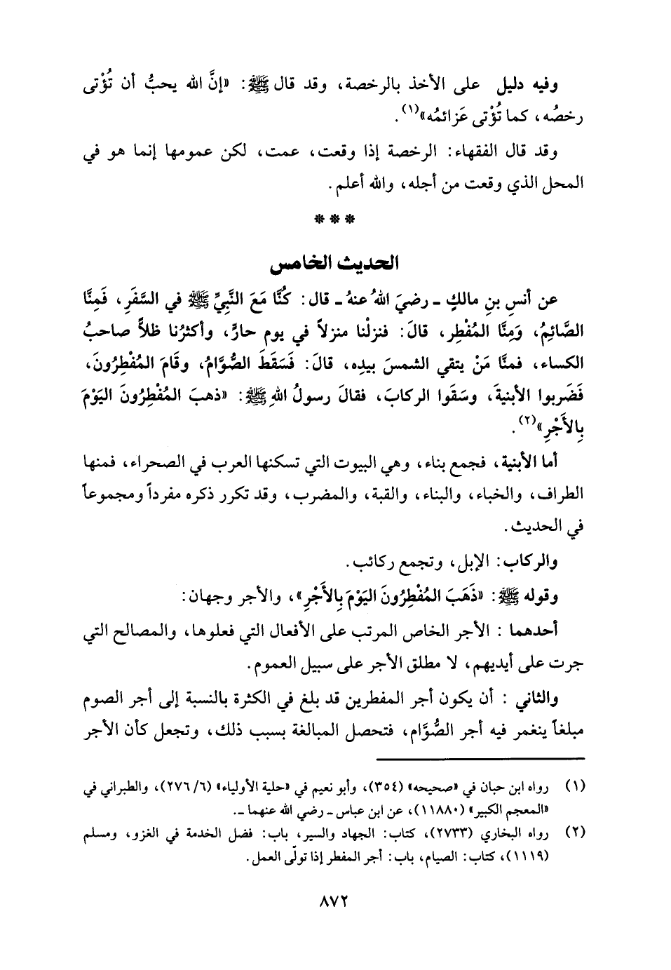 عن أنسِ بنِ مالكٍ - رضيَ اللهُ عنهُ - قال: كُنَّا مَعَ النَّبِيِّ - صلى الله عليه وسلم - في السَّفَرِ، فَمِنَّا الصَّائِمُ، وَمنَّا المُفْطِر، قالَ: فنزلْنا منزلًا في يوم حارٍّ، وأكثرُنا ظلّاً صاحبُ الكساء، فمنَّا مَنْ يتقي الشمسَ بيدِه، قالَ: فَسَقَطَ الصُّوَّامُ، وقَامَ المُفْطِرُونَ، فَضَربوا الأبنيةَ، وسَقَوا الركابَ، فقالَ رسولُ اللهِ - صلى الله عليه وسلم -: "ذهبَ المُفْطِرُونَ اليَوْمَ بِالأَجْرِ" (¬2).