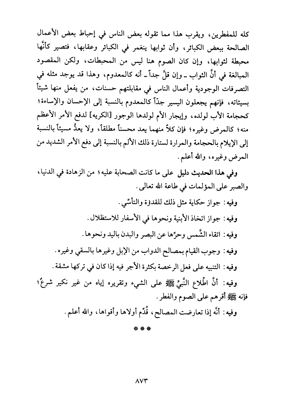 كله للمفطرين، ويقرب هذا مما تقوله بعض الناس في إحباط بعض الأعمال الصالحة ببعض الكبائر، وأن ثوابها ينغمر في الكبائر وعقابها، فتصير كأنَّها محبطة لثوابها، وإن كان الصوم هنا ليس من المحبطات، ولكن المقصود المبالغة في أنَّ الثواب -وإن قلَّ جدًّا- أنه كالمعدوم، وهذا قد يوجد مثله في التصرفات الوجودية وأعمال الناس في مقابلتهم حسنات، من يفعل منها شيئًا بسيئاته، فإنهم يجعلون اليسير جدًّا كالمعدوم بالنسبة إلى الإحسان والإساءة؛ كحجامة الأب لولده، وإيجار الأم لولدها الوجور [الكريه] لدفع الأمر الأعظم منه؛ كالمرض وغيره؛ فإن كلًّا منهما يعد محسنًا مطلقًا، ولا يعدُّ مسيئًا بالنسبة إلى الإيلام بالحجامة والمرارة لستارة ذلك الألم بالنسبة إلى دفع الأمر الشديد من المرض وغيره، والله أعلم.