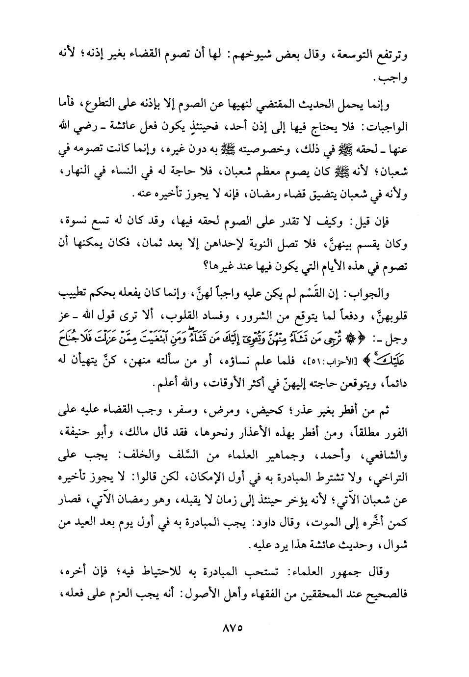 وإنما يحمل الحديث المقتضي لنهيها عن الصوم إلا بإذنه على التطوع، فأما الواجباب: فلا يحتاج فيها إلى إذن أحد، فحينئذٍ يكون فعل عائشة - رضي الله عنها - لحقه - صلى الله عليه وسلم - في ذلك، وخصوصيته - صلى الله عليه وسلم - به دون غيره، وإنما كانت تصومه في شعبان؛ لأنه - صلى الله عليه وسلم - كان يصوم معظم شعبان، فلا حاجة له في النساء في النهار، ولأنه في شعبان يتضيق قضاء رمضان، فإنه لا يجوز تأخيره عنه.