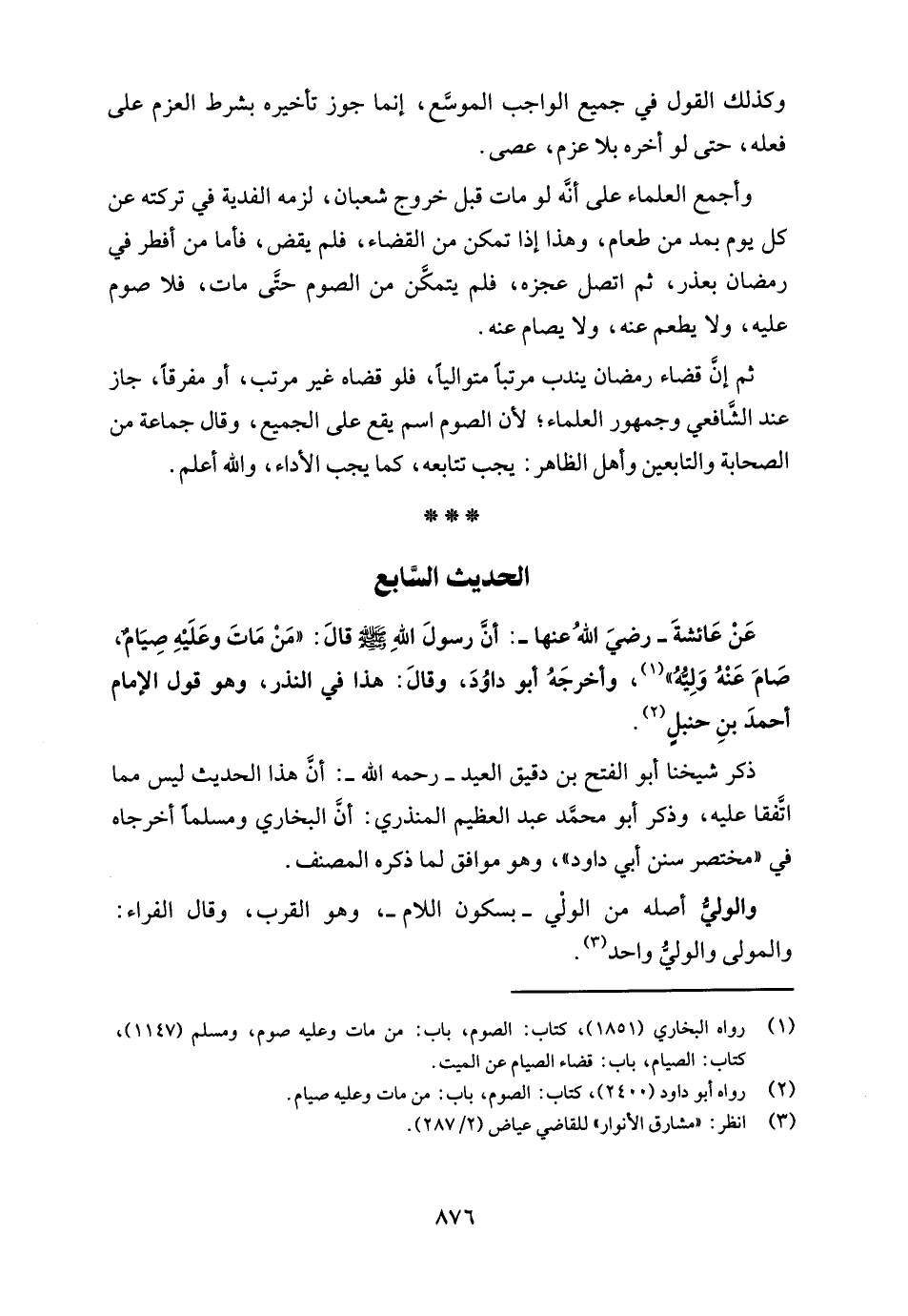 عَنْ عَائِشَةَ - رضيَ اللهُ عنها -: أنَّ رسولَ اللهِ - صلى الله عليه وسلم - قالَ: "مَنْ مَاتَ وعَلَيْهِ صِيَامٌ، صَامَ عَنْهُ وَلِيُّهُ" (¬1)، وأخرجَهُ أبو داوُدَ، وقالَ: هذا في النذر، وهو قول الإمام أحمدَ بنِ حنبلٍ (¬2).