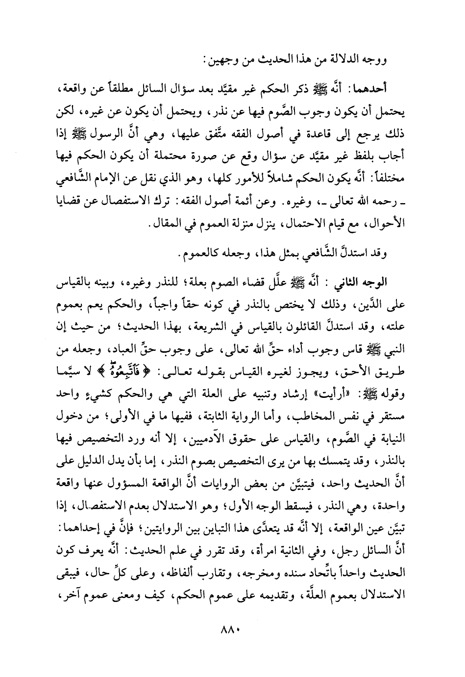 أحدهما: أنَّه - صلى الله عليه وسلم - ذكر الحكم غير مقيَّد بعد سؤال السائل مطلقًا عن واقعة، يحتمل أن يكون وجوب الصَّوم فيها عن نذر، ويحتمل أن يكون عن غيره، لكن ذلك يرجع إلى قاعدة في أصول الفقه متَّفق عليها، وهي أنَّ الرسول - صلى الله عليه وسلم - إذا أجاب بلفظ غير مقيَّد عن سؤال وقع عن صورة محتملة أن يكون الحكم فيها مختلفًا: أنه يكون الحكم شاملًا للأمور كلها، وهو الَّذي نقل عن الإمام الشَّافعي - رحمه الله تعالى -، وغيره. وعن أئمة أصول الفقه: ترك الاستفصال عن قضايا الأحوال، مع قيام الاحتمال، ينزل منزلة العموم في المقال.