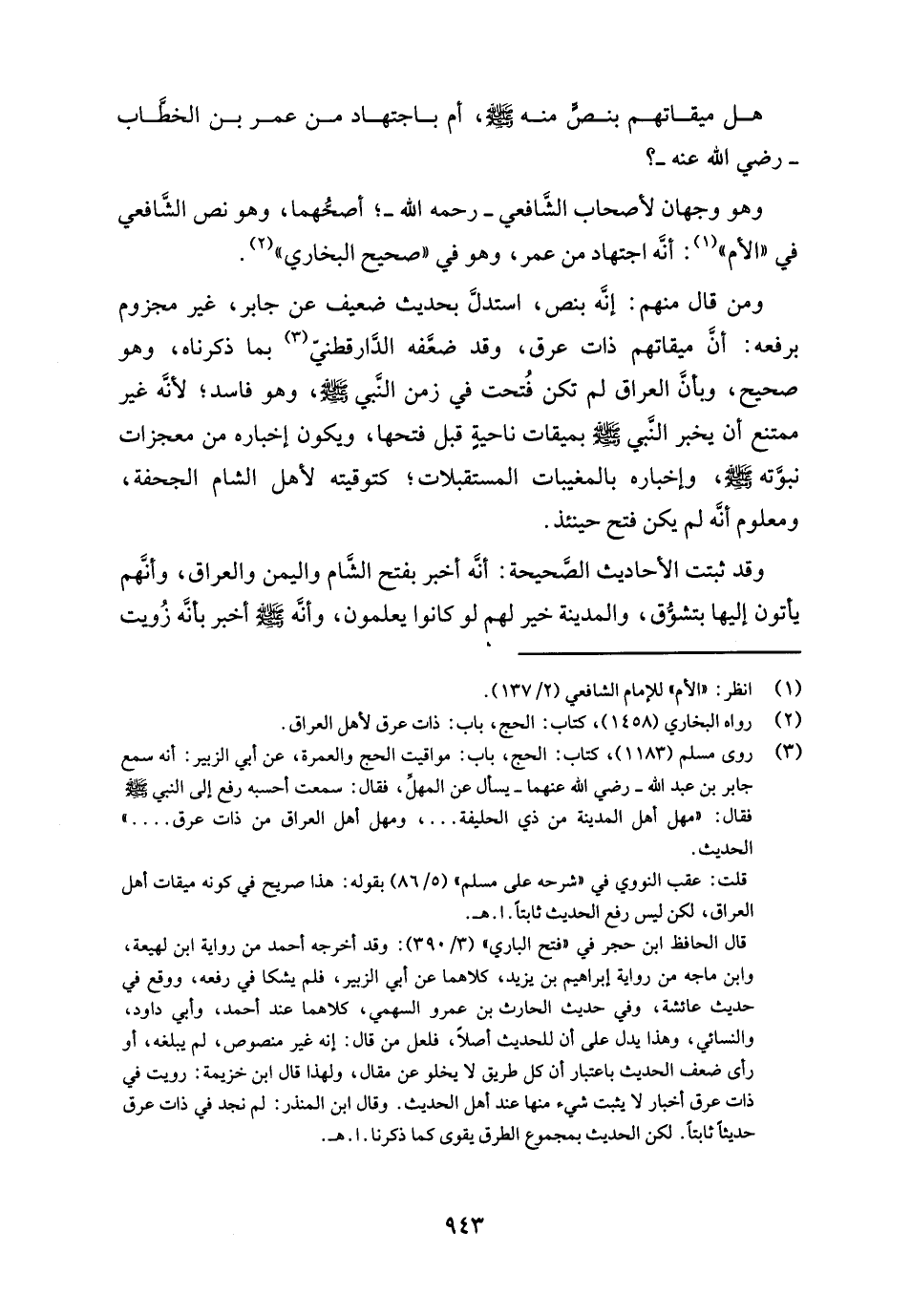 ومن قال منهم: إنَّه بنص، استدلَّ بحديث ضعيف عن جابر، غير مجزوم برفعه: أنَّ ميقاتهم ذات عرق، وقد ضعَّفه الدَّارقطني (¬3) بما ذكرناه، وهو صحيح، وبأن العراق لم تكن فُتحت في زمن النَّبي - صلى الله عليه وسلم -، وهو فاسد؛ لأنَّه غير ممتنع أنَّ يخبر النَّبي - صلى الله عليه وسلم - بميقات ناحيةٍ قبل فتحها، ويكون إخباره من معجزات نبوَّته - صلى الله عليه وسلم -، وإخباره بالمغيبات المستقبلات؛ كتوقيته لأهل الشام الجحفة، ومعلوم أنَّه لم يكن فتح حينئذ.