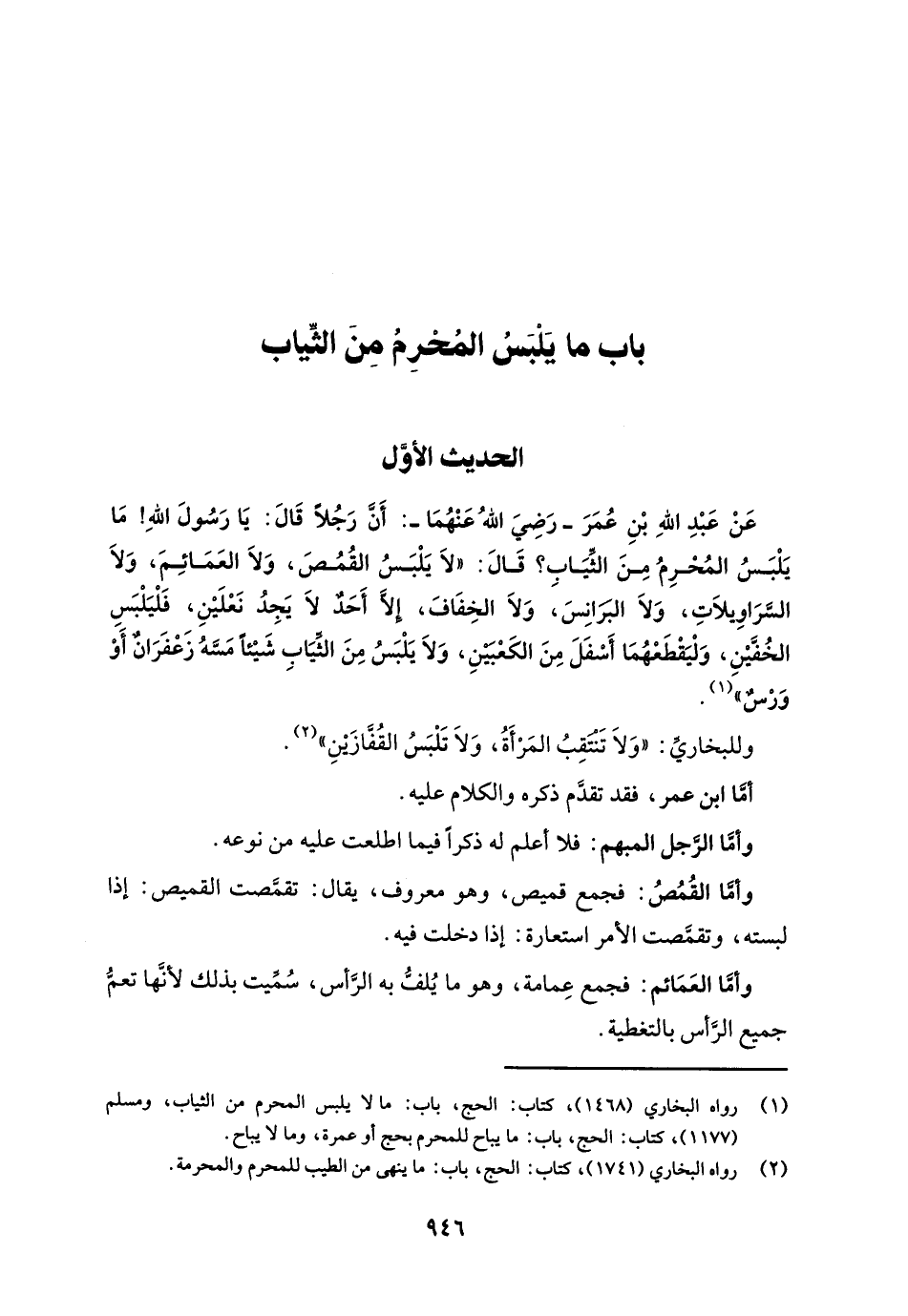 عَنْ عَبْدِ اللهِ بْنِ عُمَرَ - رَضِيَ اللهُ عَنْهُمَا -: أَنَّ رَجُلًا قَالَ: يَا رَسُولَ اللهِ! مَا يَلْبَسُ المُحْرِمُ مِنَ الثِّيَابِ؟ قَالَ: "لَا يَلْبَسُ القُمُصَ، وَلَا العَمَائِمَ، وَلَا السَّرَاوِيلَاتِ، وَلَا البرَانِسَ، وَلَا الخِفَافَ، إلا أَحَدٌ لَا يَجِدُ نَعْلَيْنِ، فَلْيَلْبَسِ الخُفَّيْنِ، وَلْيَقْطَعْهُمَا أَسْفَلَ مِنَ الكَعْبَيْنِ، وَلَا يَلْبَسُ مِنَ الثِّيَابِ شَيْئًا مَسَّهُ زَعْفَرَانٌ أَوْ وَرْسٌ" (¬1).