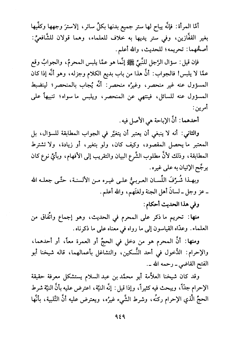 ومنها: أنَّ المحرم هو من دخل في الحجِّ أو العمرة معًا، أو أحدهما، والإحرام: الدُّخول في أحد النُّسكين، والتشاغل بأعمالهما، قاله شيخنا أبو الفتح القاضي - رحمه الله -.