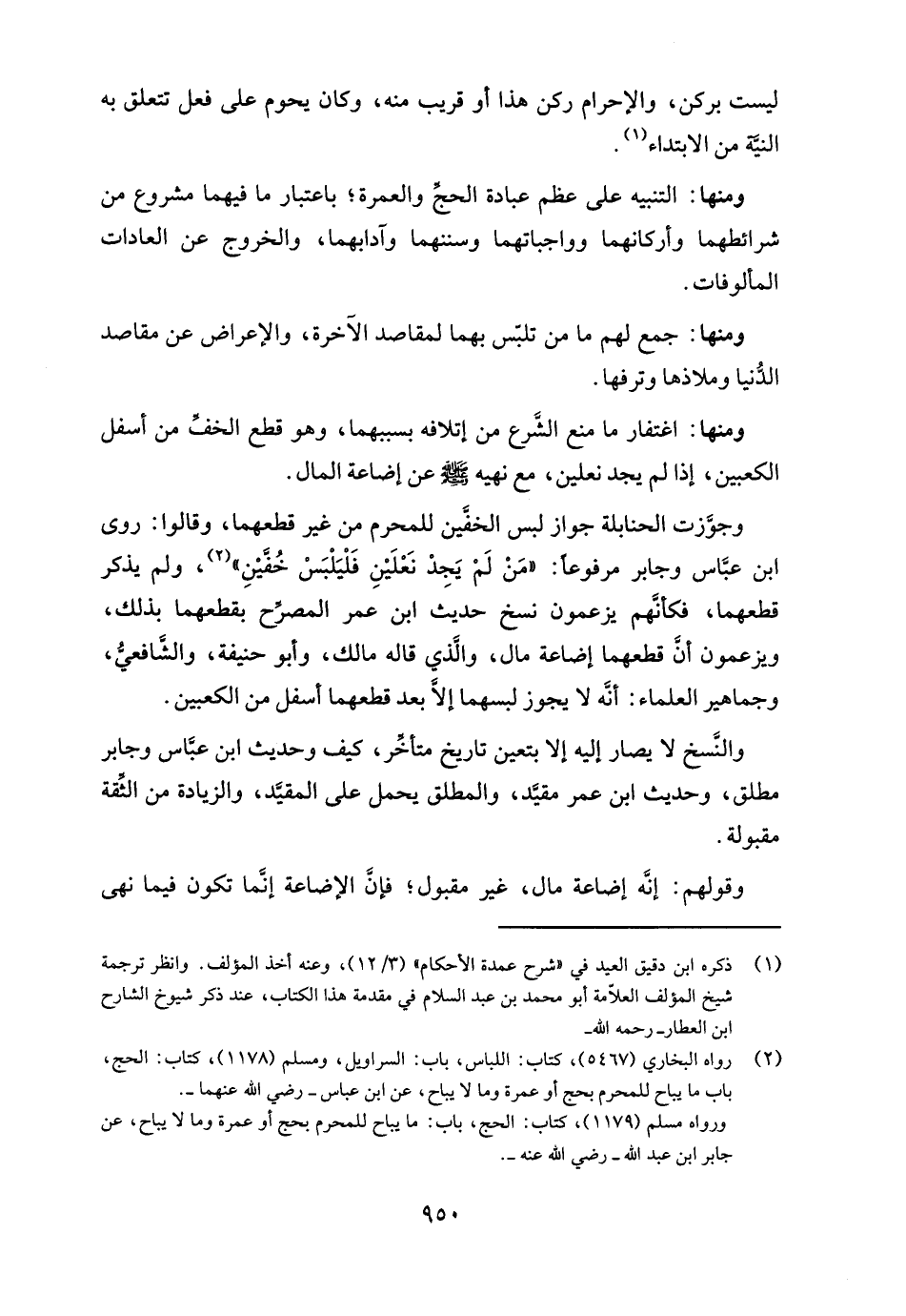 ومنها: اغتفار ما منع الشَّرع من إتلافه بسببهما، وهو قطع الخفِّ من أسفل الكعبين، إذا لم يجد نعلين، مع نهيه - صلى الله عليه وسلم - عن إضاعة المال.