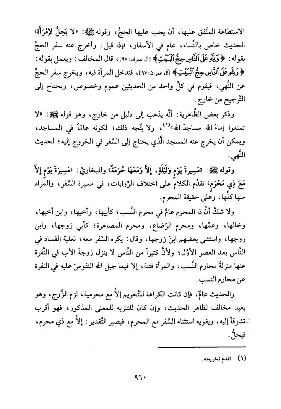 الاستطاعة المتَّفق عليها، أن يجب عليها الحجُّ، وقوله - صلى الله عليه وسلم -: "لا يَحِلُّ لاِمْرَأَة" الحديث خاص بالنِّساء، عام في الأسفار، فإذا قيل: وأخرج عنه سفر الحجِّ بقوله: {وَلِلَّهِ عَلَى النَّاسِ حِجُّ الْبَيْتِ} [آل عمران: 97]، قال المخالف: ويعمل بقوله: {وَلِلَّهِ عَلَى النَّاسِ حِجُّ الْبَيْتِ} [آل عمران: 97]، فتدخل المرأة فيه، ويخرج سفر الحجِّ عن النَّهي، فيقوم في كلِّ واحد من الحديثين عموم وخصوص، ويحتاج إلى التَّرجيح من خارج.