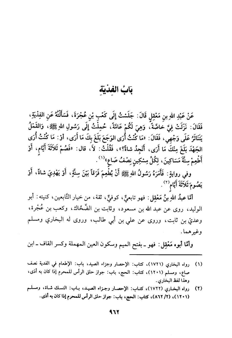 عَنْ عَبْدِ اللهِ بنِ مَعْقِلٍ قَالَ: جَلَسْتُ إِلَى كَعْبِ بْنِ عُجْرَةَ، فَسَأَلْتُهُ عَنِ الفِدْيَةِ، فَقَالَ: نَزَلَتْ فِيِّ خاصَّةً، وَهِيَ لَكُمْ عَامَّةً، حُمِلْتُ إِلَى رَسُولِ اللهِ - صلى الله عليه وسلم -، وَالقَمْلُ يَتَنَاثَرُ عَلَى وَجْهِي، فَقَالَ: "مَا كُنْتُ أُرَى الوَجَعَ بَلَغَ بِكَ مَا أَرَى، أوْ: مَا كُنْتُ أُرَى الجَهْدَ بَلَغَ مِنْكَ مَا أَرَى، أَتَجِدُ شاةً؟ "، فَقُلْتُ: لَا، قال: "فَصُمْ ثَلاَثَةَ أَيَّامٍ، أَوْ أَطْعِمْ سِتَّةَ مَسَاكِينَ، لِكُلِّ مِسْكِينٍ نِصْفُ صَاعٍ" (¬1).