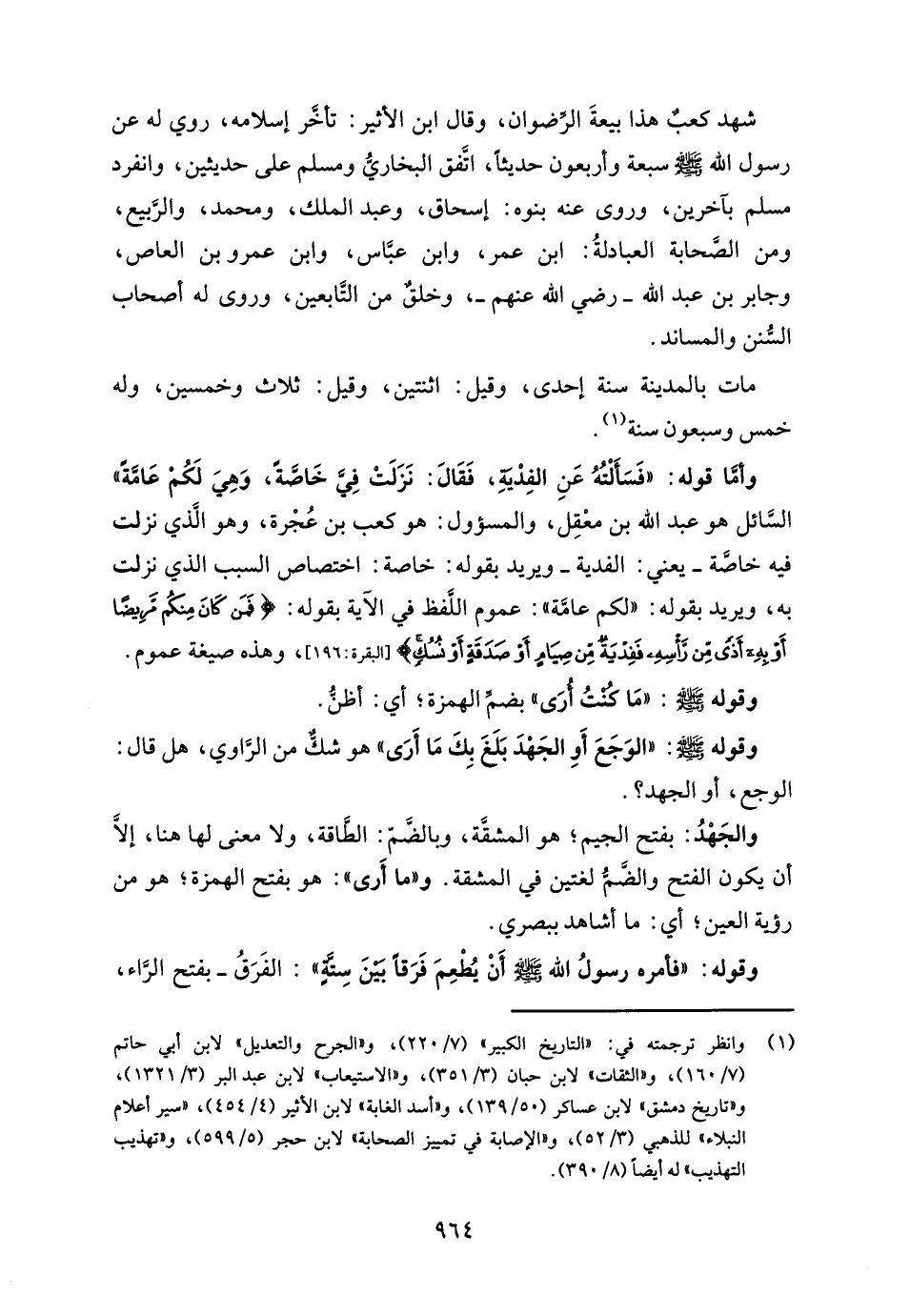 وأمَّا قوله: "فَسَأَلْتُهُ عَنِ الفِدْيَةِ، فَقَالَ: نَزَلَتْ فِيَّ خَاصَّةً، وَهِيَ لَكُمْ عَامَّةً" السَّائل هو عبد الله بن معْقِل، والمسؤول: هو كعب بن عُجْرة، وهو الَّذي نزلت فيه خاصَّة -يعني: الفدية- ويريد بقوله: خاصة: اختصاص السبب الذي نزلت به، ويريد بقوله: "لكم عامَّة": عموم اللفظ في الآية بقوله: {فَمَنْ كَانَ مِنْكُمْ مَرِيضًا أَوْ بِهِ أَذًى مِنْ رَأْسِهِ فَفِدْيَةٌ مِنْ صِيَامٍ أَوْ صَدَقَةٍ أَوْ نُسُكٍ} [البقرة: 196]، وهذه صيغة عموم.