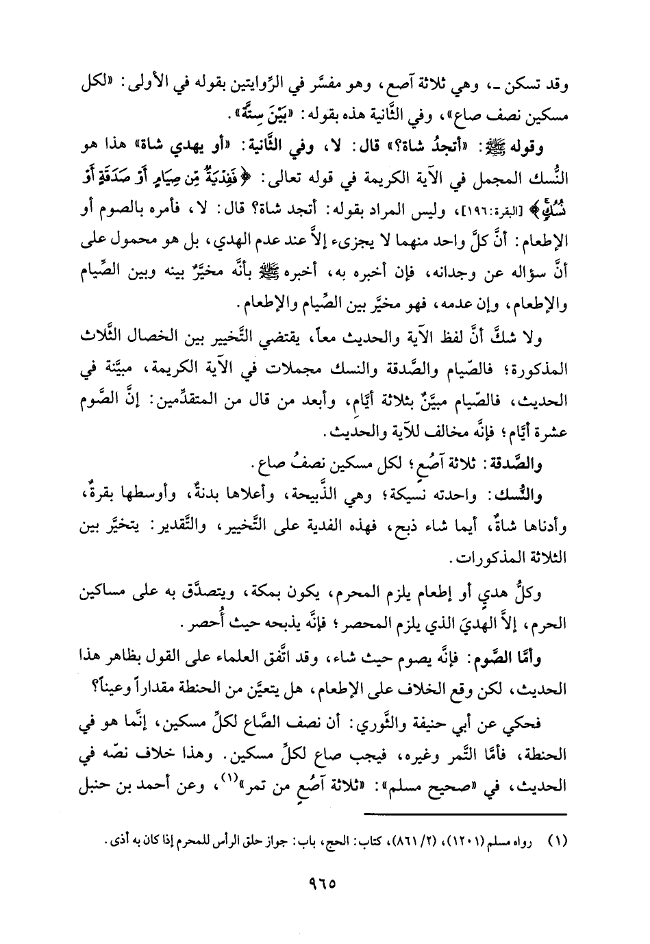 وقوله - صلى الله عليه وسلم -: "أتجدُ شاة؟ " قال: لا، وفي الثَّانية: "أو يهدي شاة" هذا هو النُّسك المجمل في الآية الكريمة في قوله تعالى: {فَفِدْيَةٌ مِنْ صِيَامٍ أَوْ صَدَقَةٍ أَوْ نُسُكٍ} [البقرة: 196]، وليس المراد بقوله: أتجد شاة؟ قال: لا، فأمره بالصوم أو الإطعام: أنَّ كلَّ واحد منهما لا يجزئ إلَّا عند عدم الهدي، بل هو محمول على أنَّ سؤاله عن وجدانه، فإن أخبره به، أخبره - صلى الله عليه وسلم - بأنَّه مخيَّر بينه وبين الصِّيام والإطعام، وإن عدمه، فهو مخيَّر بين الصِّيام والإطعام.