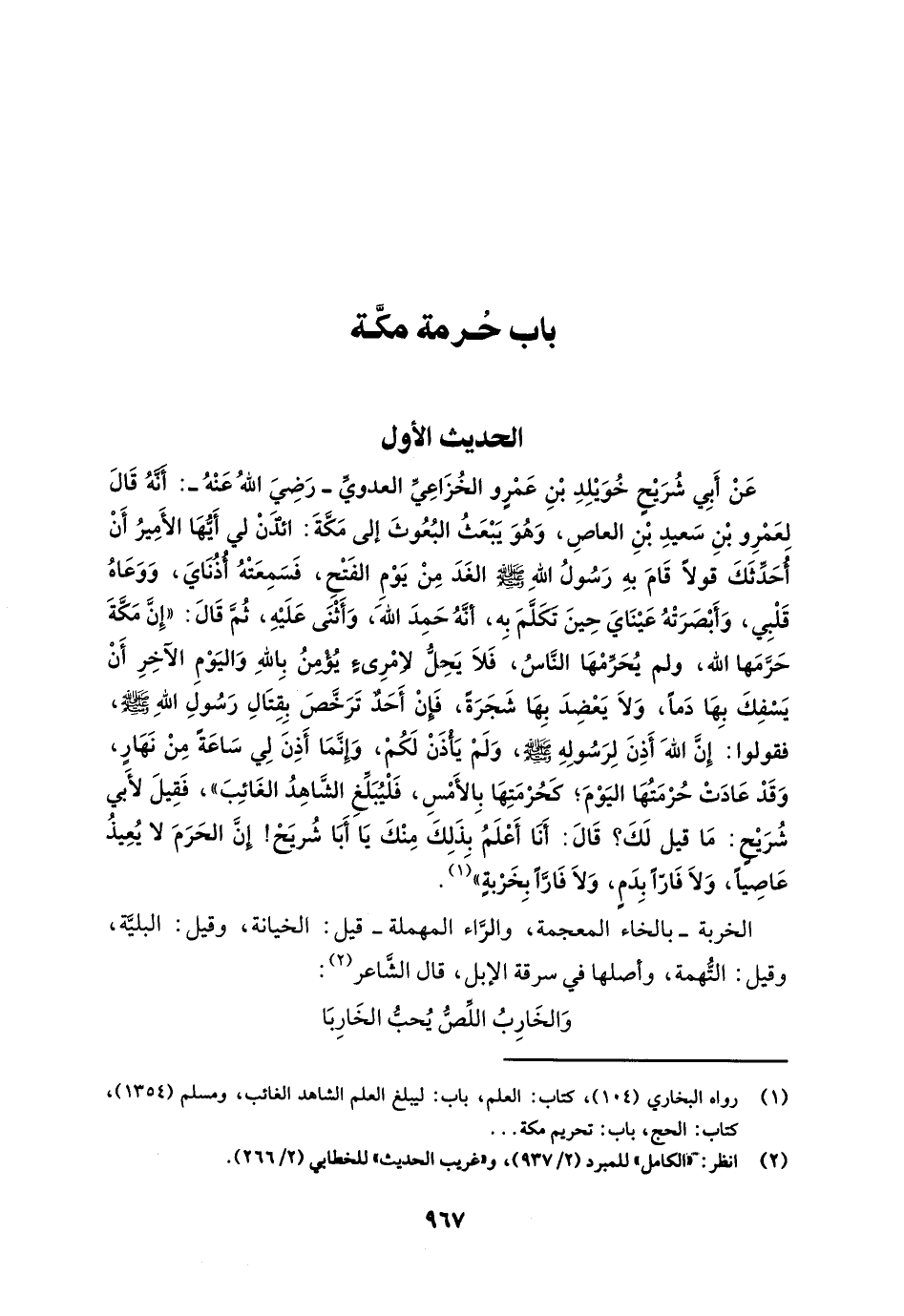عَنْ أَبِي شُرَيْحٍ خُوَيْلِدِ بْنِ عَمْرٍو الخُزَاعِيِّ العدويِّ -رَضِيَ اللهُ عَنْهُ-: أَنَّهُ قَالَ لِعَمْرِو بْنِ سَعيدِ بْنِ العاصِ، وَهُوَ يَبْعَثُ البُعُوثَ إلى مَكَّةَ: ائذَنْ لي أَيُّهَا الأَمِيرُ أَنْ أُحَدِّثَكَ قولًا قَامَ بهِ رَسُولُ اللهِ - صلى الله عليه وسلم - الغَدَ مِنْ يَوْمِ الفَتْحِ، فَسَمِعَتْهُ أُذُنَايَ، وَوَعَاهُ قَلْبِي، وَأَبْصَرَتْهُ عَيْنَايَ حِينَ تَكَلَّمَ بِه، أنَّهُ حَمِدَ اللهَ، وَأَثْنَى عَلَيْهِ، ثُمَّ قَالَ: "إِنَّ مَكَّةَ حَرَّمَها الله، ولم يُحَرِّمْهَا النَّاسُ، فَلَا يَحِلُّ لاِمْرِئٍ يُؤْمِنُ بِاللهِ وَاليَوْمِ الآخِرِ أَنْ يَسْفِكَ بِهَا دَمًا، وَلَا يَعْضِدَ بِهَا شَجَرَةً، فَإِنْ أَحَدٌ تَرَخَّصَ بِقِتَالِ رَسُولِ اللهِ - صلى الله عليه وسلم -، فقولوا: إِنَّ اللهَ أَذِنَ لِرَسُولِهِ - صلى الله عليه وسلم -، وَلَمْ يَأْذَنْ لَكُمْ، وَإِنَّمَا أَذِنَ لِي سَاعَةً مِنْ نَهَارٍ، وَقَدْ عَادَتْ حُرْمَتُهَا اليَوْمَ؛ كَحُرْمَتِهَا بِالأَمْسِ، فَلْيُبَلِّغِ الشَّاهِدُ الغَائِبَ"، فَقِيلَ لأَبي شُرَيْحٍ: مَا قيل لَكَ؟ قَالَ: أَنَا أَعْلَمُ بِذَلِكَ مِنْكَ يَا أَبَا شُريَحْ! إِنَّ الحَرَمَ لا يُعِيذُ عَاصِيًا، وَلَا فَارًّا بِدَمٍ، وَلَا فَارًّا بِخَرْبةٍ" (¬1).
