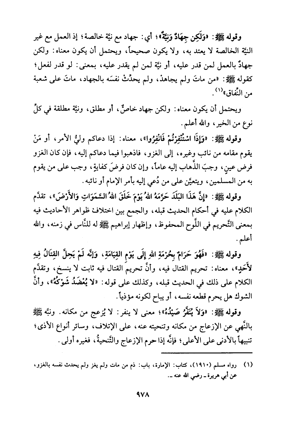 وقوله - صلى الله عليه وسلم -: "وَلَكِن جِهَادٌ وَنِيَّةٌ"؛ أي: جهاد مع نيَّة خالصة؛ إذ العمل مع غير النيَّة الخالصة لا يعتد به، ولا يكون صحيحًا، ويحتمل أن يكون معناه: ولكن جهادٌ بالعمل لمن قدر عليه، أو نيَّة لمن لم يقدر عليه، بمعنى: لو قدر لفعل؛ كقوله - صلى الله عليه وسلم -: "من ماتَ ولم يجاهدْ، ولم يحدِّثْ نفسَه بالجهاد، ماتَ على شعبة من النِّفاق" (¬1).